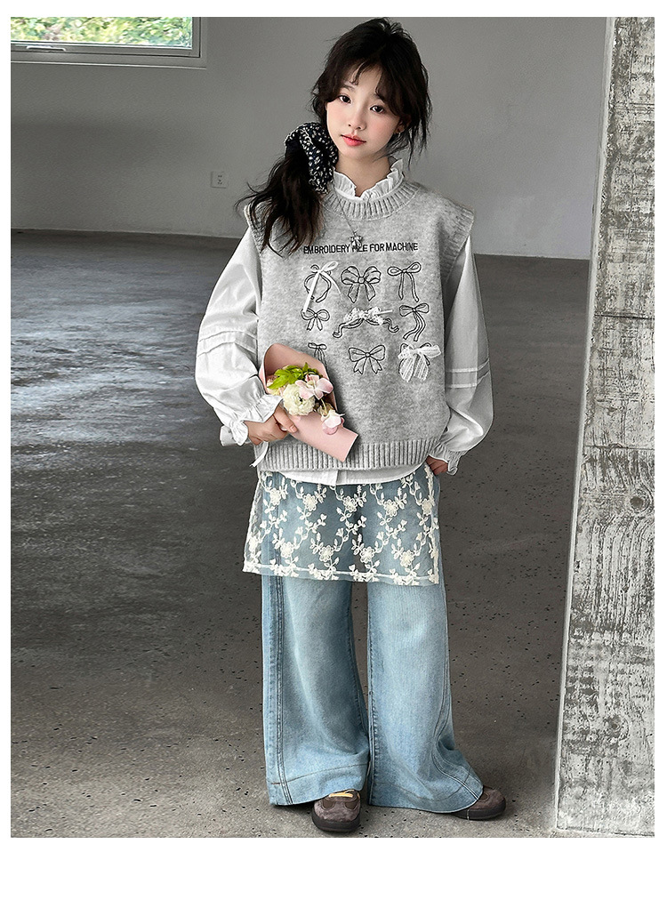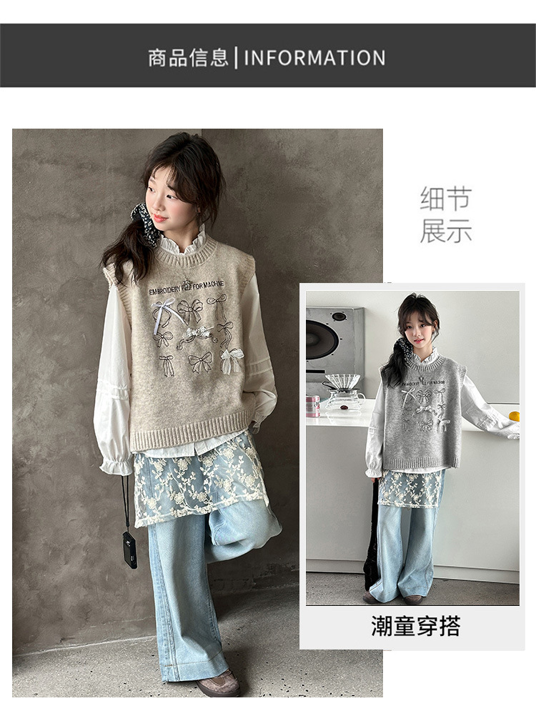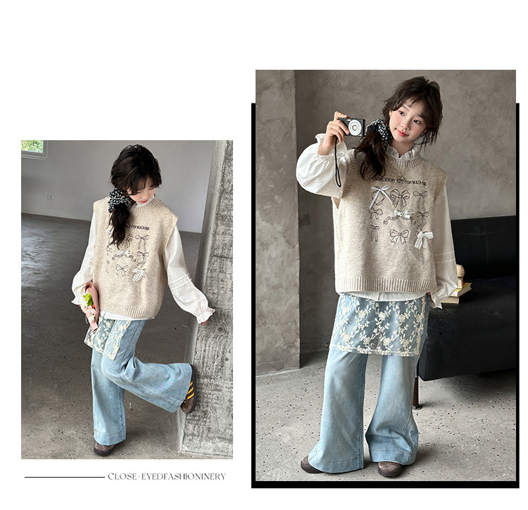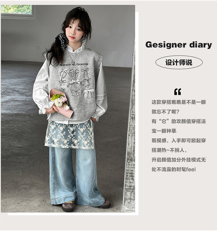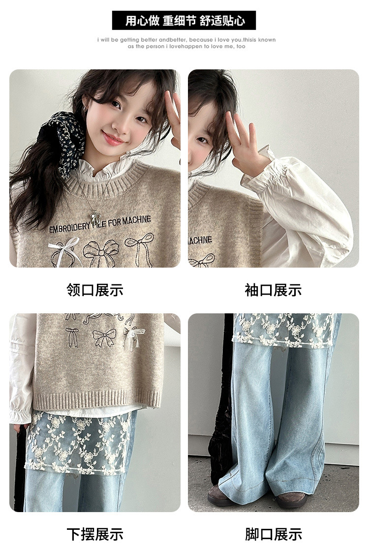 女童春季蝴蝶结毛线马甲套装2026新款中大童春装针织背心牛仔裤潮