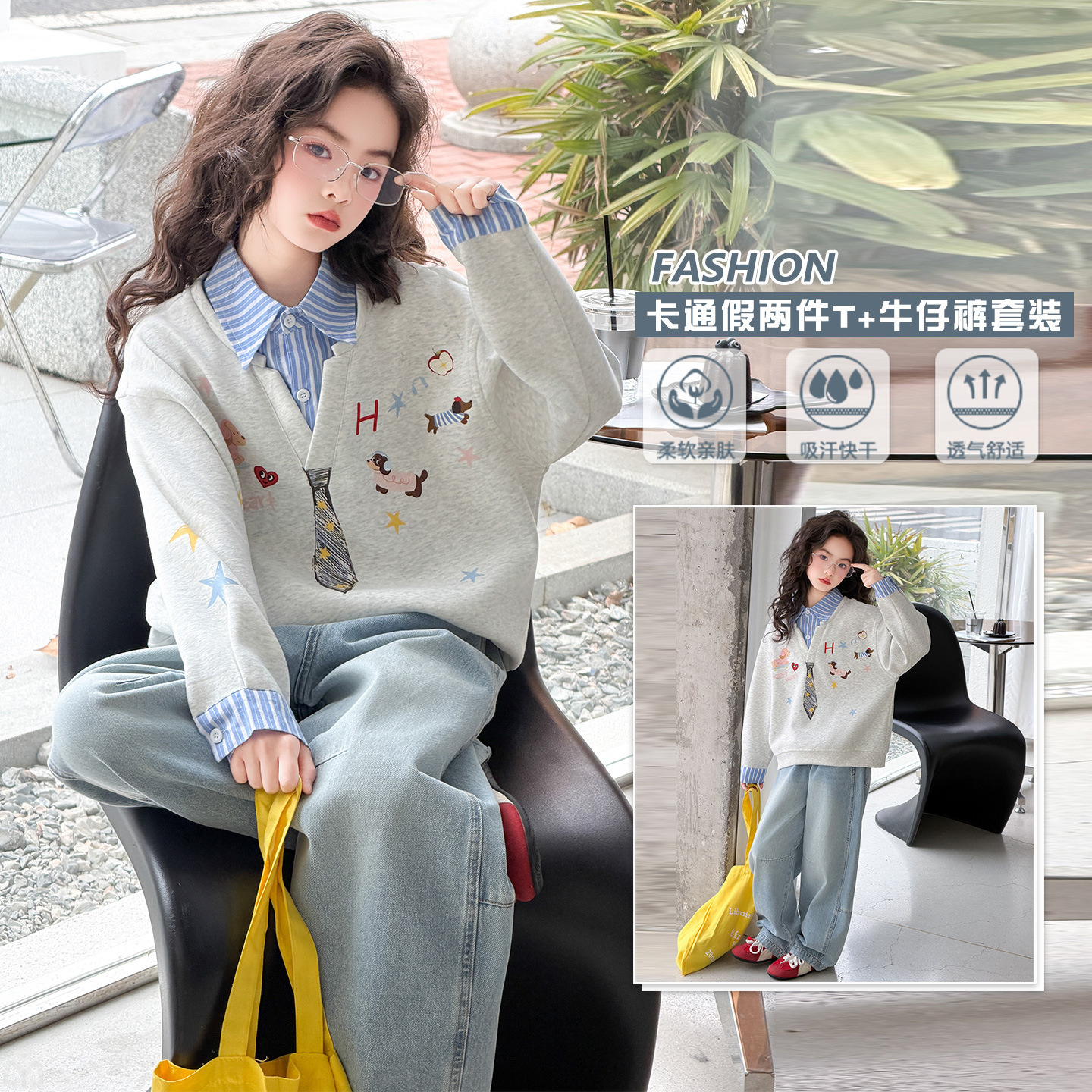 女童春秋套装2026新款女大童时尚假两件卡通印花卫衣牛仔裤两件套