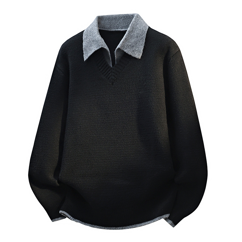 高档跨境冬季新款加厚衬衫领毛衣男士假两件针织衫保暖套头打底衫