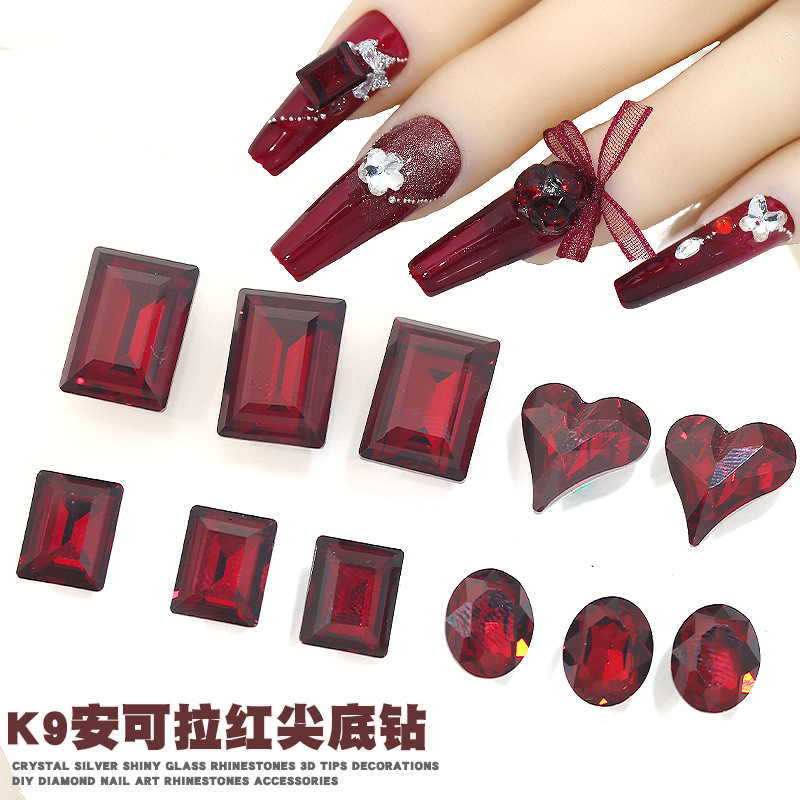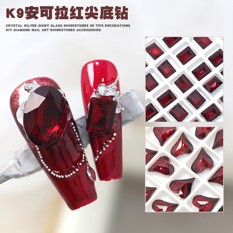 批发新年安可拉红k9美甲钻椭圆长方歪心指甲堆钻配饰DIY 指甲装饰
