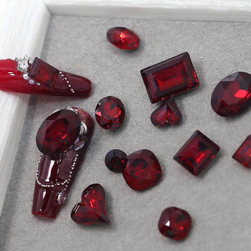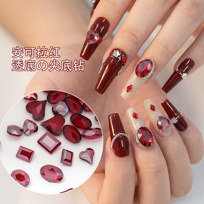 批发酒红色新年美甲钻饰安可拉红长方椭圆大歪心堆钻配饰指甲饰品