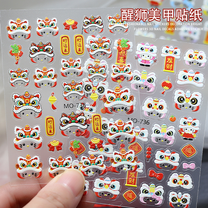 新年国风醒狮美甲贴纸5D浮雕立体招财喜庆狮子头舞狮指甲贴装饰品