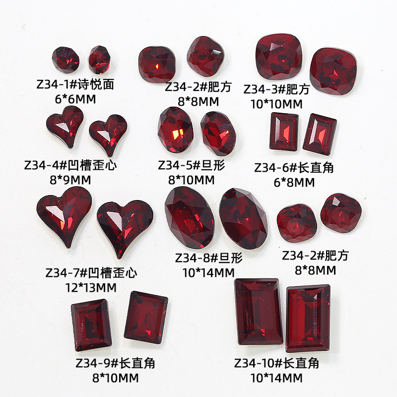 规格 z34-1#K9诗悦面[【6*6】1颗,z34-2#K9肥方【8*8】 1颗,z34-3#K9肥方【10*10】 1颗,z34-4#K9凹槽歪心【8*9】 1颗,z34-7#K9凹槽歪心【12*13】 1颗,z34-5#K9旦形【8*10】 1颗,z34-8#k9旦形【10*14】1颗,z34-9#K9长直角【8*10】 1颗,z34-10#K9长直角【10*14】 1颗,z34-11#K9长直角【6*8】 1颗