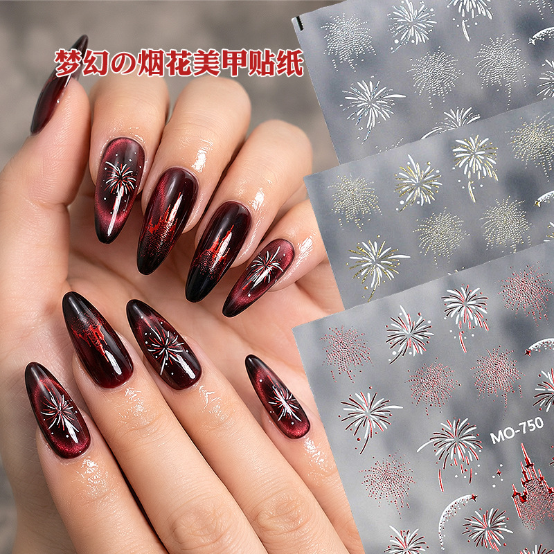 新年烟花美甲贴纸梦幻城堡流金银红色璀璨烟花指甲贴穿戴甲装饰贴