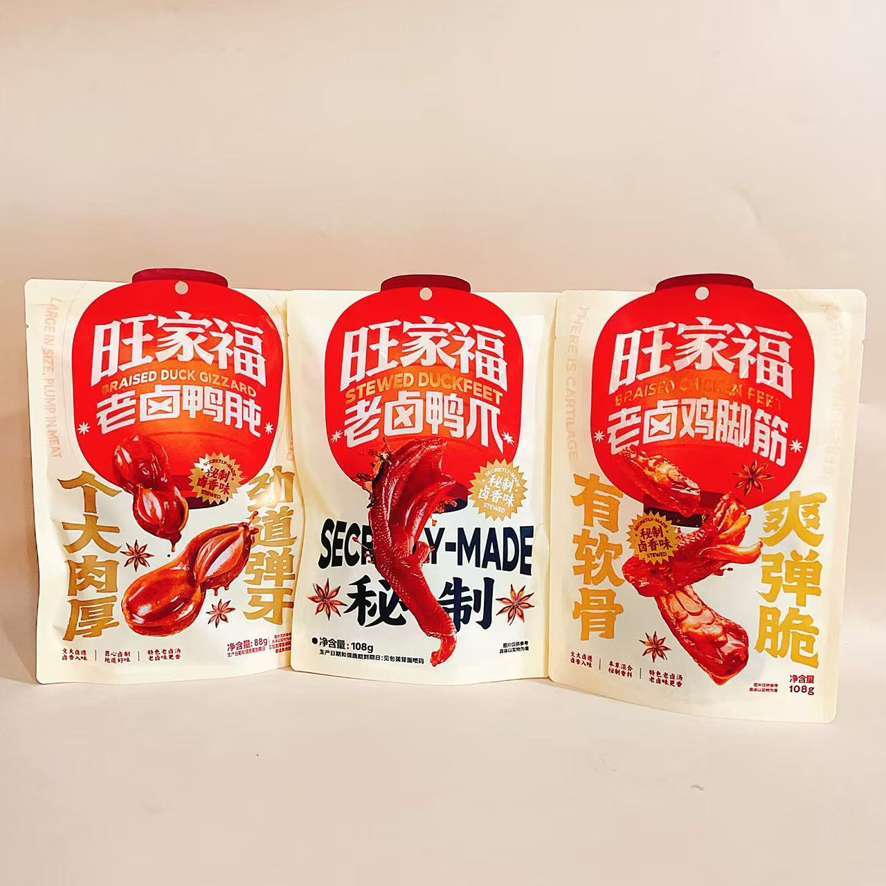 包装规格 旺家福-老卤鸭翅-卤香味245g*1袋(一箱20袋),旺家福-老卤鸭翅-香辣味245g*1袋(一箱20袋),旺家福-老卤鸭脖-卤香味245g*1袋(一箱20袋),旺家福-老卤鸭脖-香辣味245g*1袋(一箱20袋),旺家福-老卤鸭爪-香辣味108g*1袋(一箱30袋),旺家福-老卤鸭爪-卤香味108g*1袋(一箱30袋),旺家福-老卤鸭肫-卤香味88g*1袋(一箱30袋),旺家福-老卤鸭肫-香辣味88g*1袋(一箱30袋),旺家福-老卤鸡脚筋-卤香味108g*1袋(一箱30袋),旺家福-老卤鸡脚筋-香辣味108g*1袋(一箱30袋)