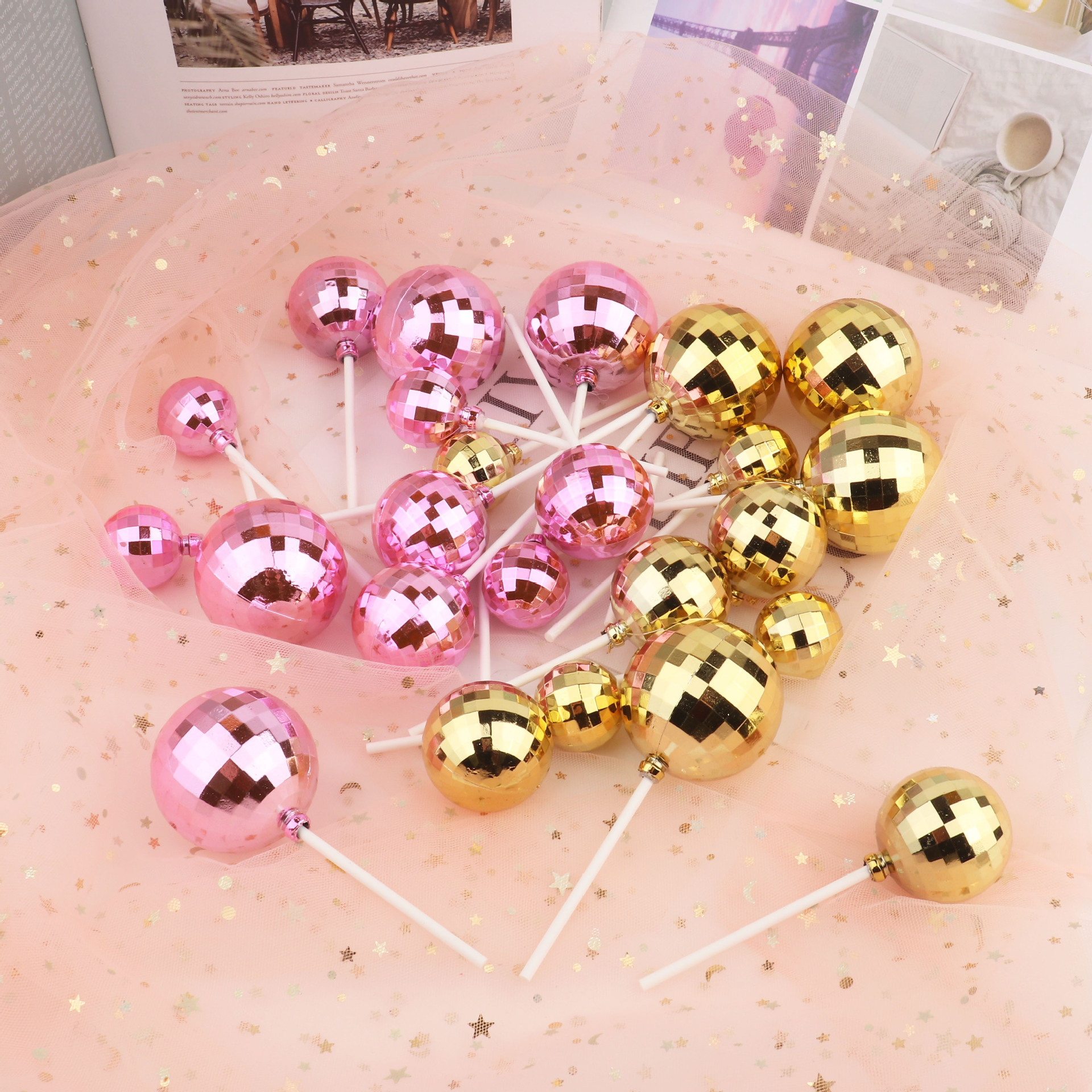 新しいインバレエスタイルゴールデンシルバーディスコボールケーキデコレーションデザートテーブルオーナメントプラグインカード
