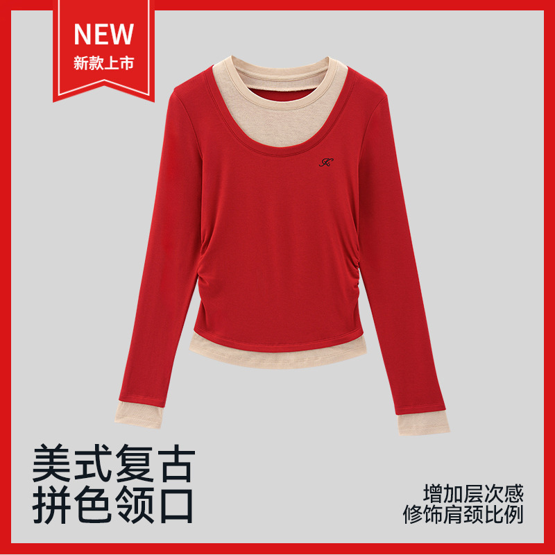 2026春季新款美式复古撞色假两件修身打底衫女长袖T恤内搭上衣