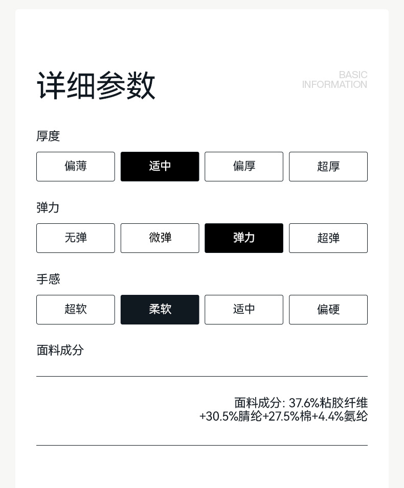 面料成分含量 37.6%粘胶纤维+30.5%腈纶+27.5%棉+4.4%氨纶