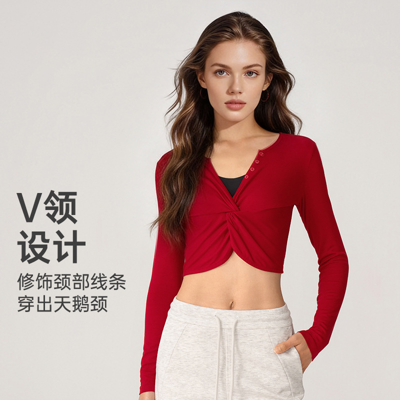 新款前胸扭结V领开口户外运动休闲薄款长袖上衣