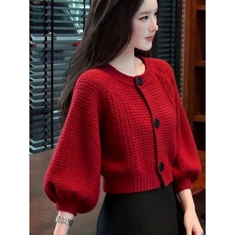 宽松慵懒风短款针织外套上衣新年战袍红色灯笼袖毛衣开衫女秋冬季