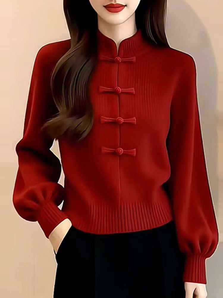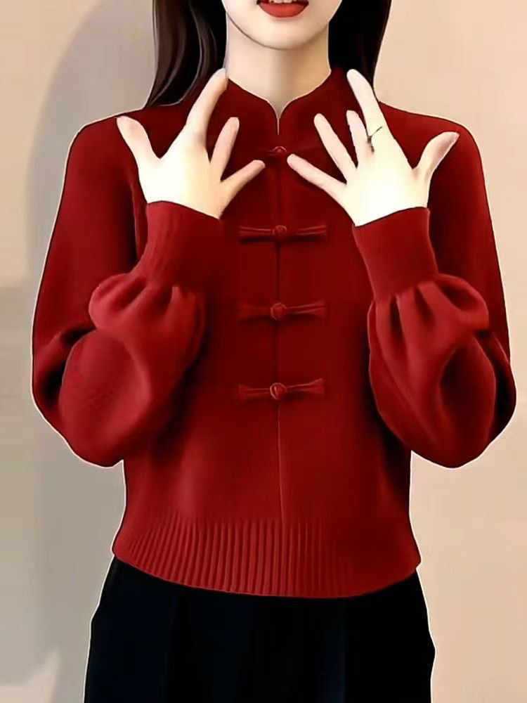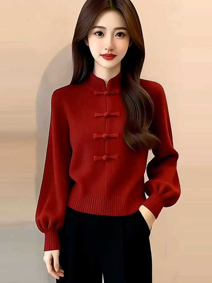 多巴胺红色氛围感小立领盘扣针织上衣女韩系显瘦减龄小众针织毛衣