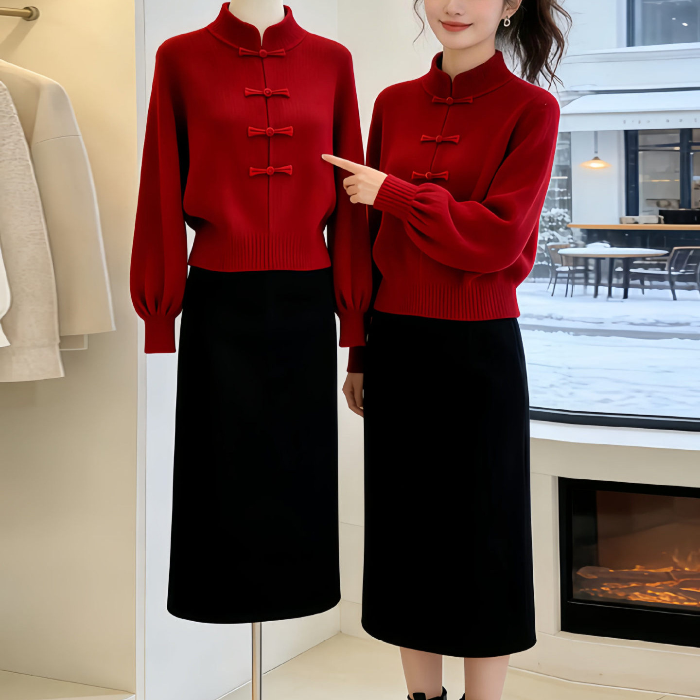 好看新中式红色盘扣毛衣女2026新款秋冬新年跨年穿搭立领针织上衣