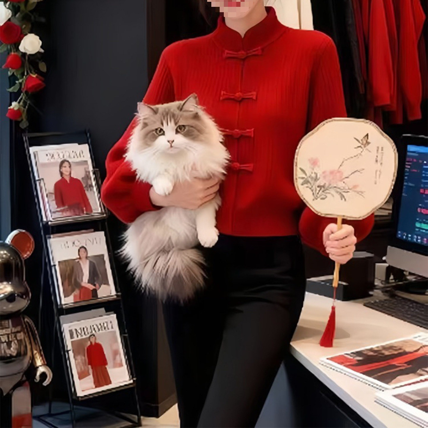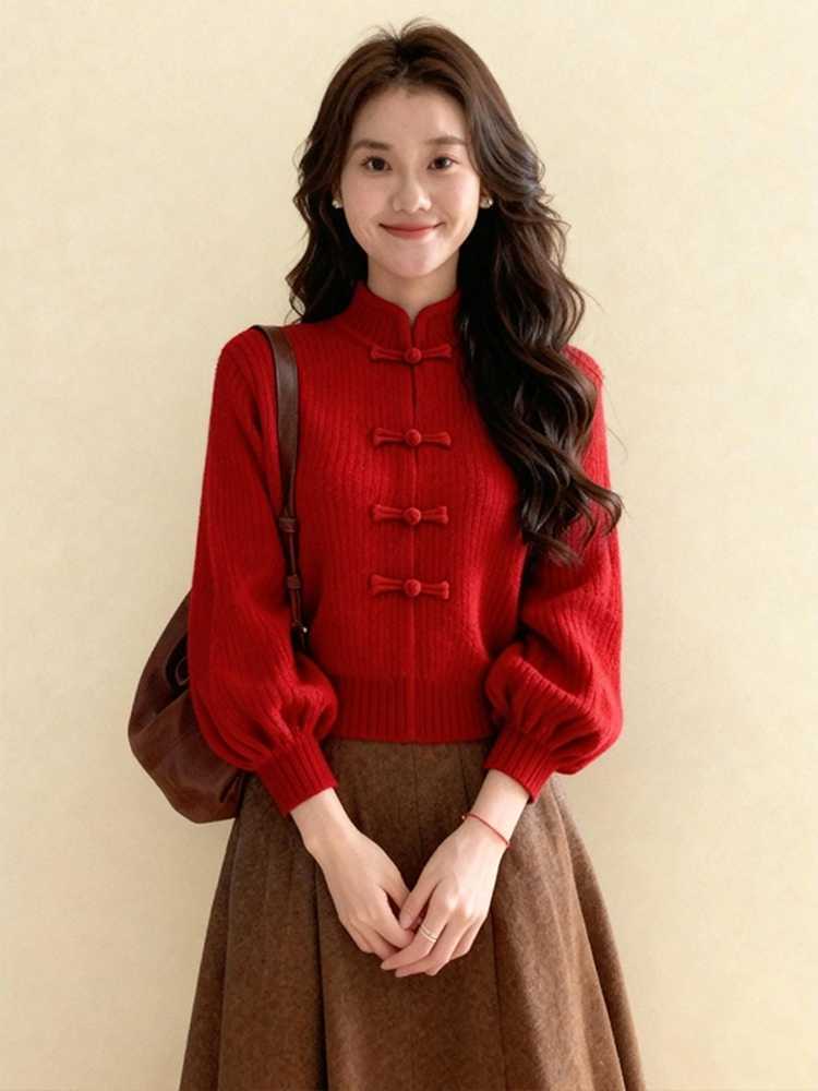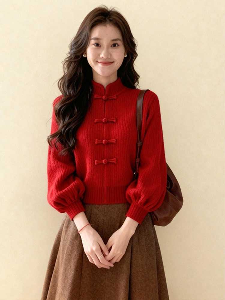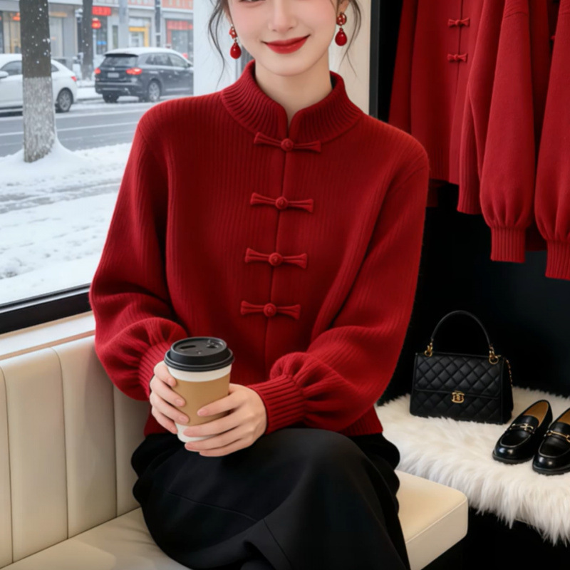 2026本命年红色氛围感新年穿搭毛衣新中式立领盘扣软糯针织开衫女