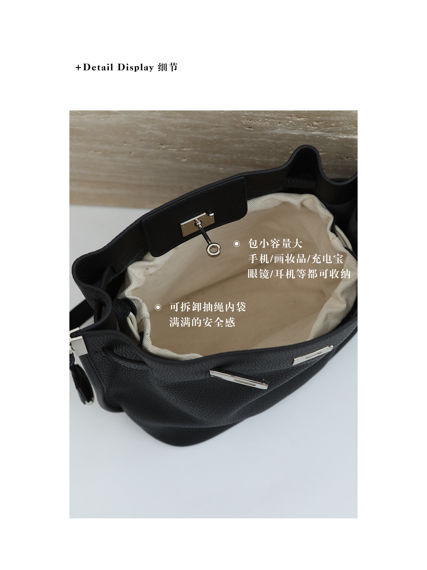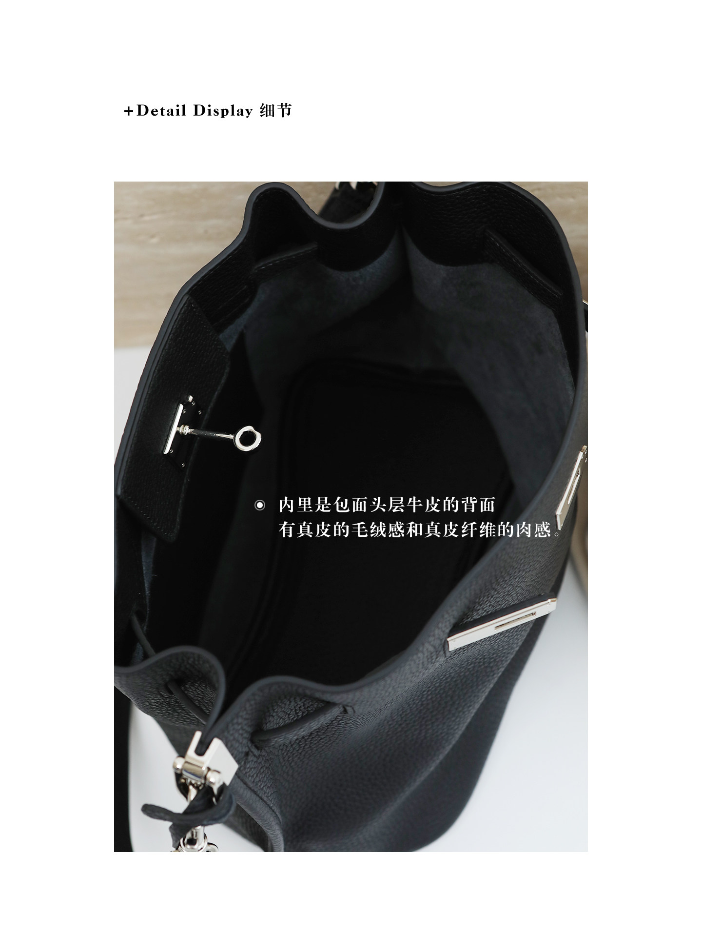 Fabric/包里材质: 头层牛皮的背面(内里配抽绳布袋)