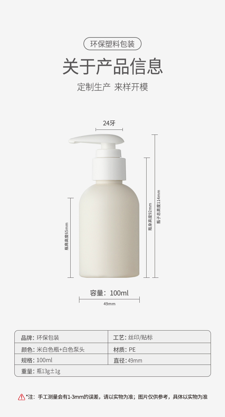 规格型号 100ml;米白色瓶+白色泵头;HDPE