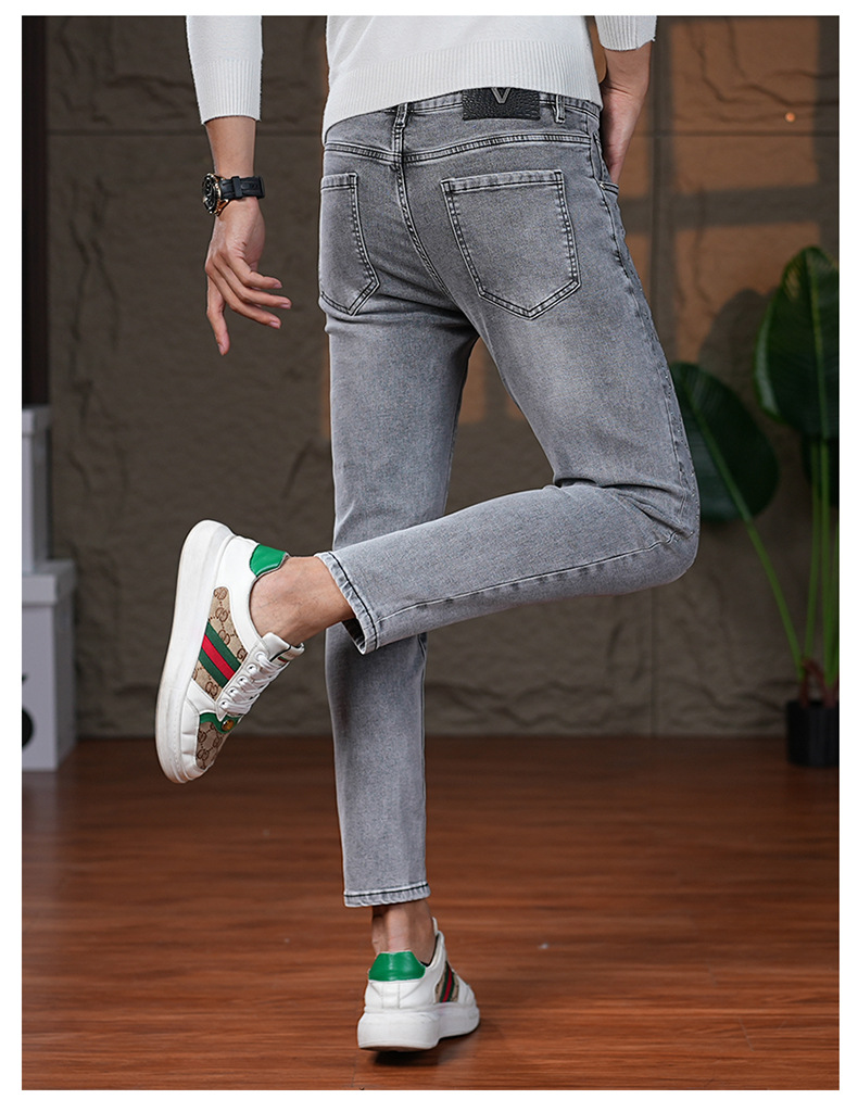 元のメーカーはヨーロッパ版の軽い豪華なファッションブランドの弾力性の小さい足のデニムのズボンの薄い金の修身の灰色の男性のズボンを代行します。