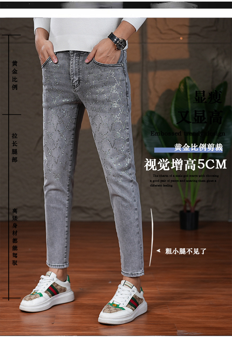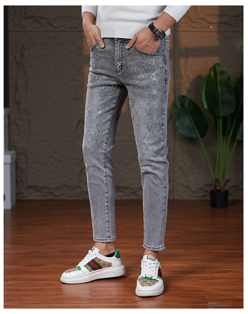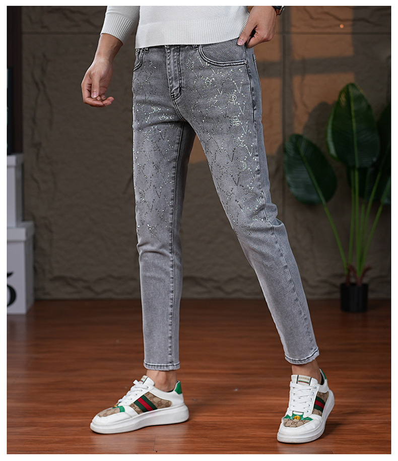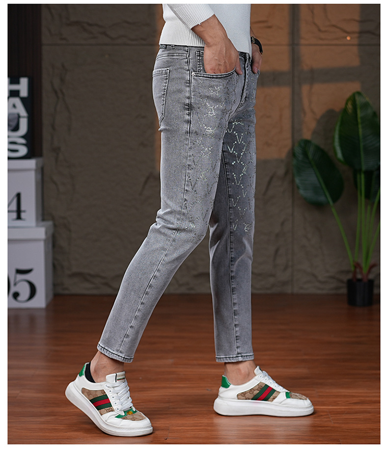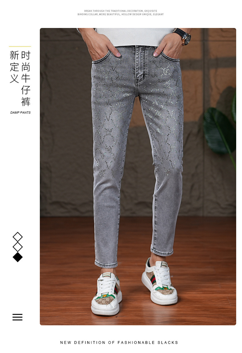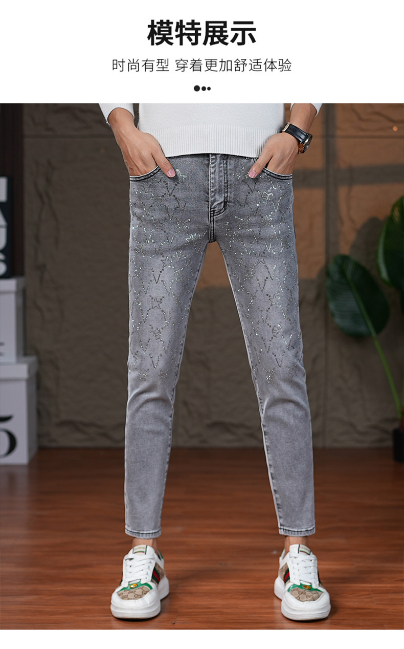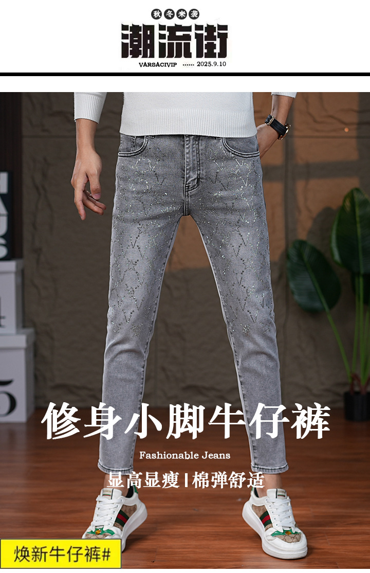 高端烟灰色牛仔裤男士2025秋季新款潮牌烫钻修身小脚百搭弹力九分