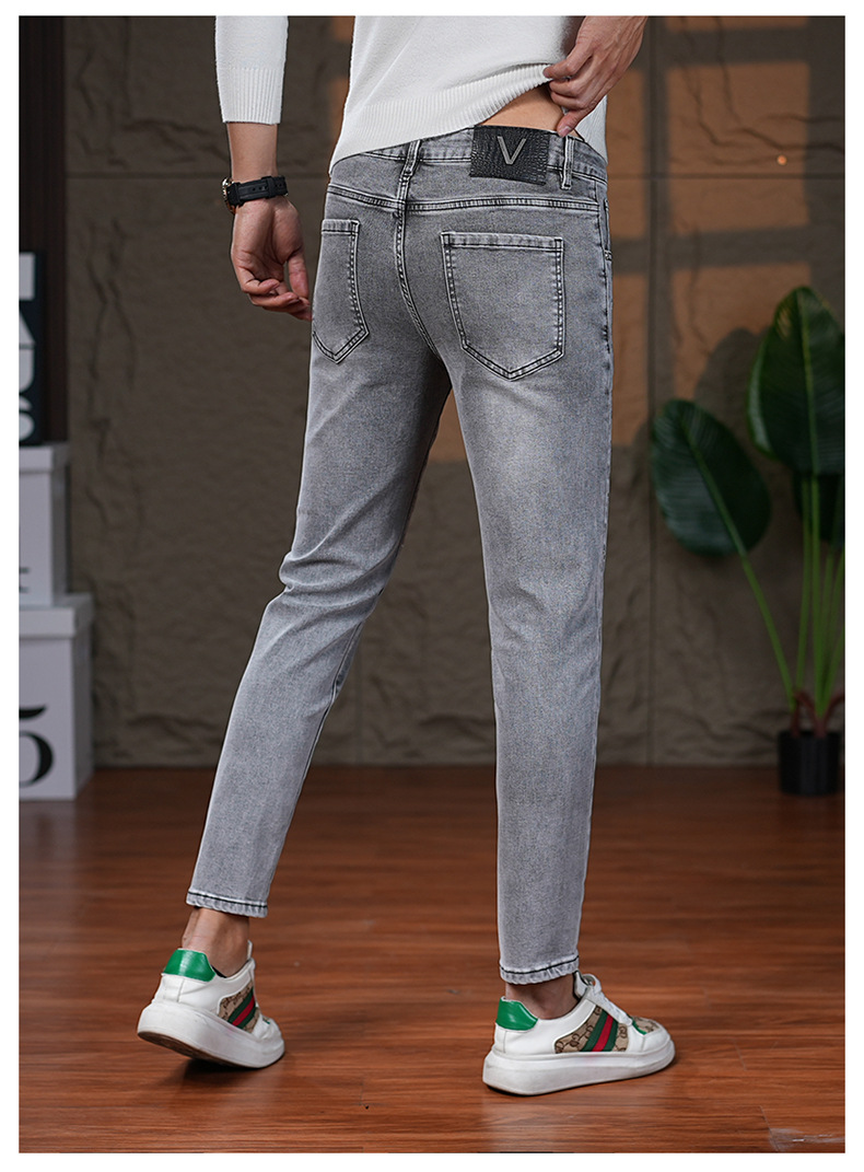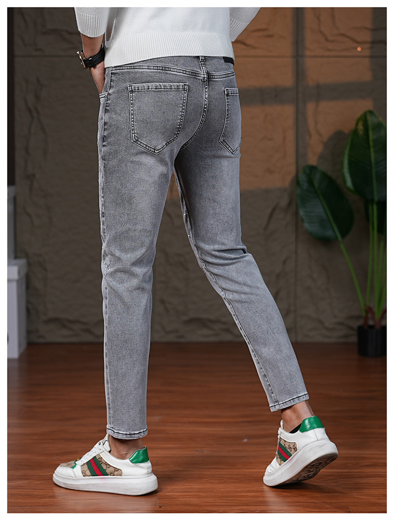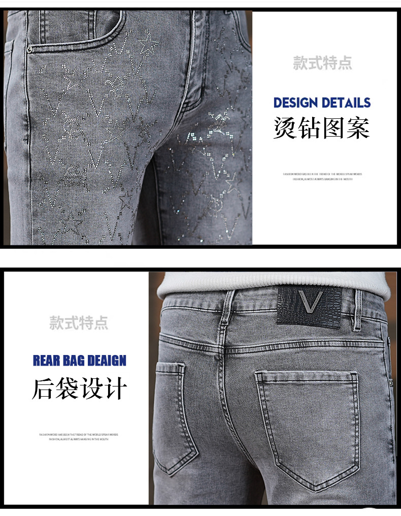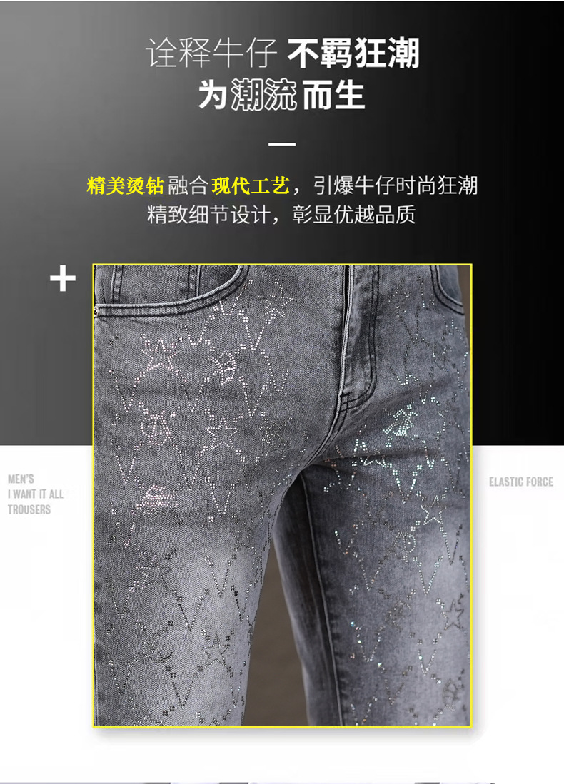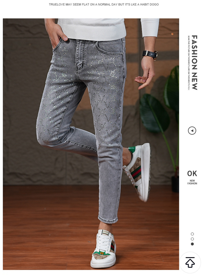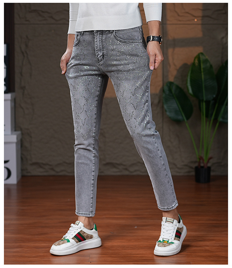 高端烟灰色牛仔裤男士2025秋季新款潮牌烫钻修身小脚百搭弹力九分