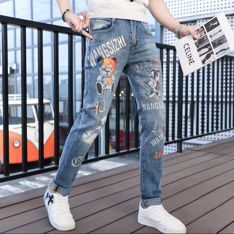 ヨーロッパの街頭のパンダのプリントの薄い色のジーパンの男性の高い街のズボンは水洗いして格好がいいです。