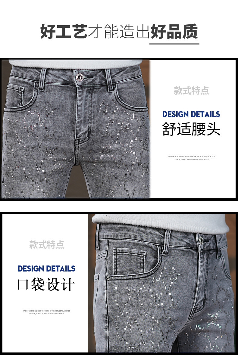 高端烟灰色牛仔裤男士2026春季新款潮牌烫钻修身小脚百搭弹力九分