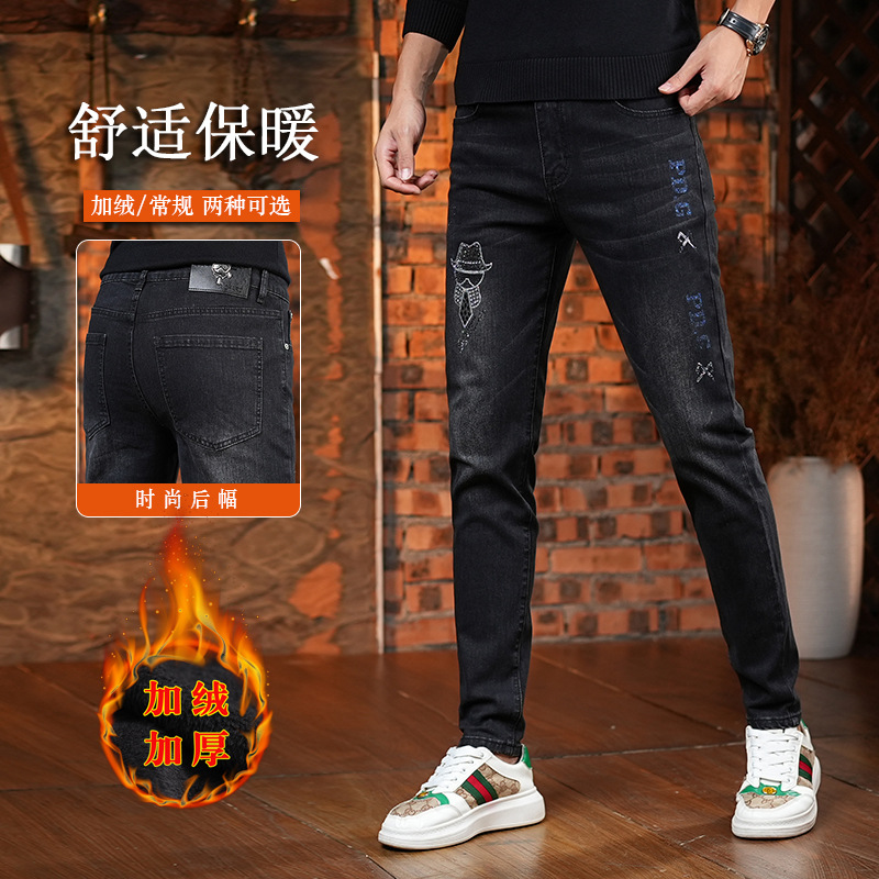 高端黑色男士2025冬季新款潮牌烫钻修身小脚百搭加绒牛仔裤长裤