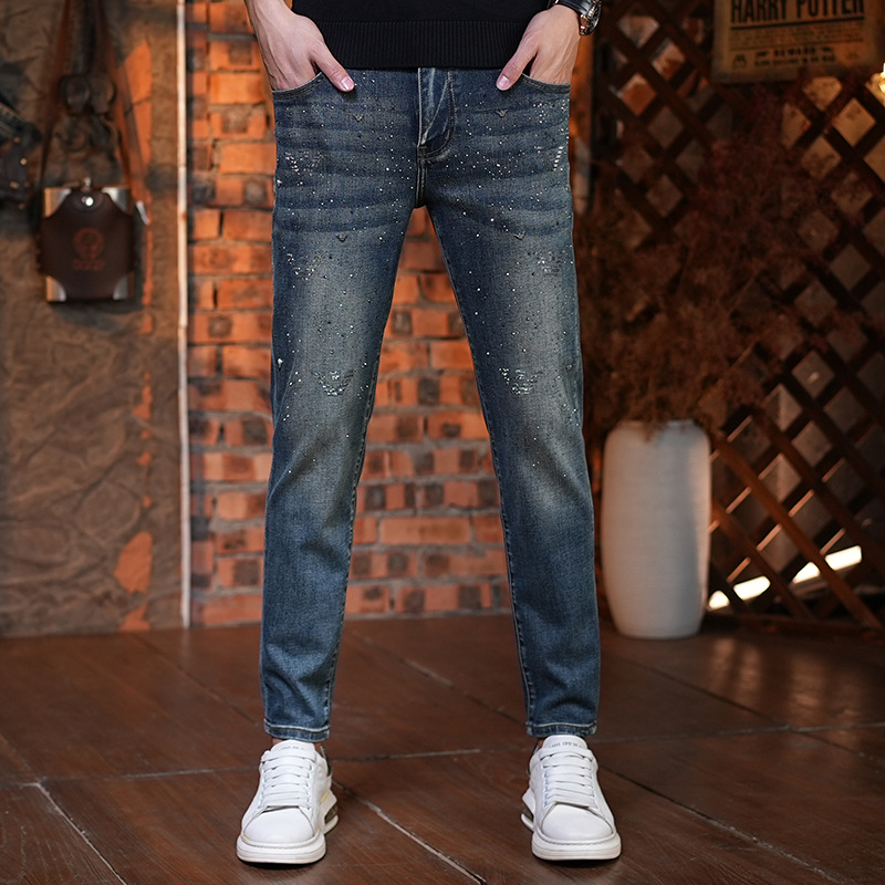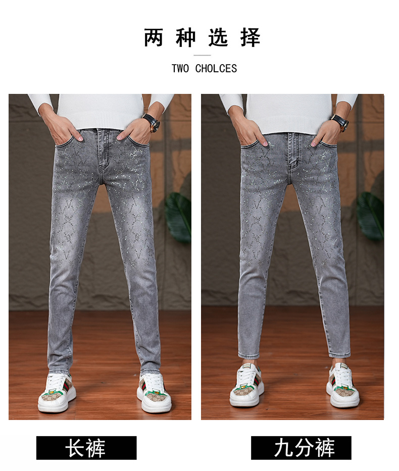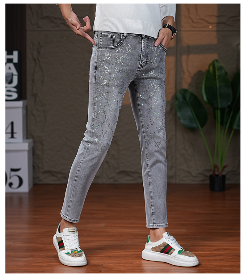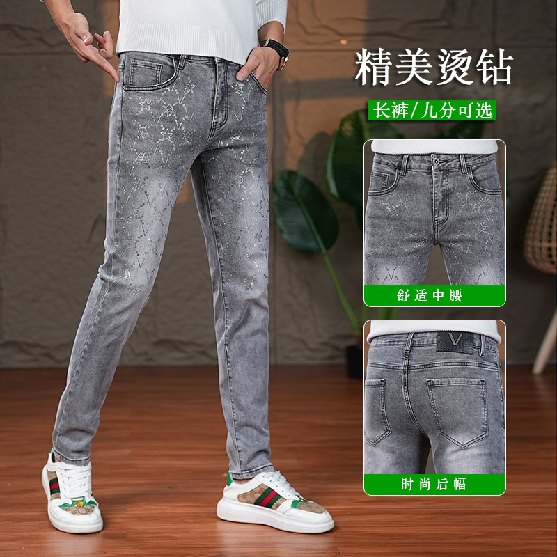 2023春夏ヨーロッパ系ジーンズメンズ重工ラインストーンプリントトレンドブランドカジュアルスリムフィットスキニーパンツファッション
