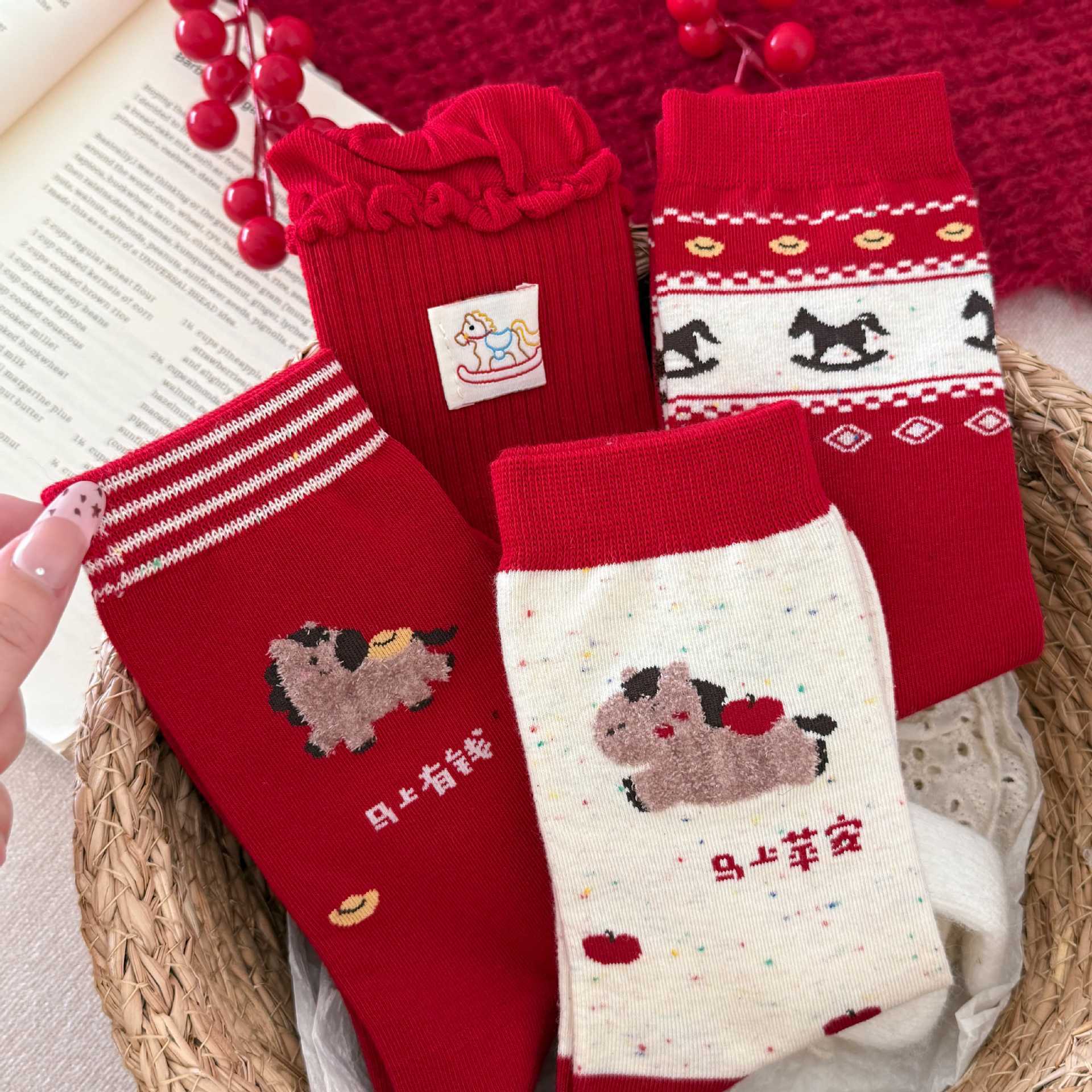 新年红色袜子女本命年秋冬中筒袜2026马年冬季可爱卡通抗起球长袜