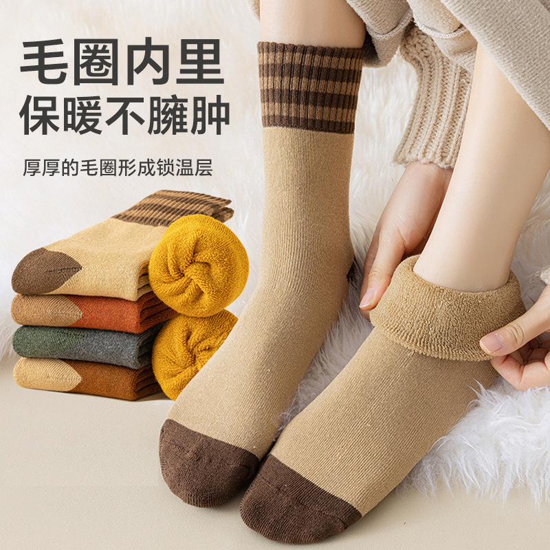 厳選された毛織りソックス、女性用秋冬厚手ミドル丈ソックス、三本ライン、日本風、暖かいタオルソックス、暖かいロングソックス、流行のソックス、女性用