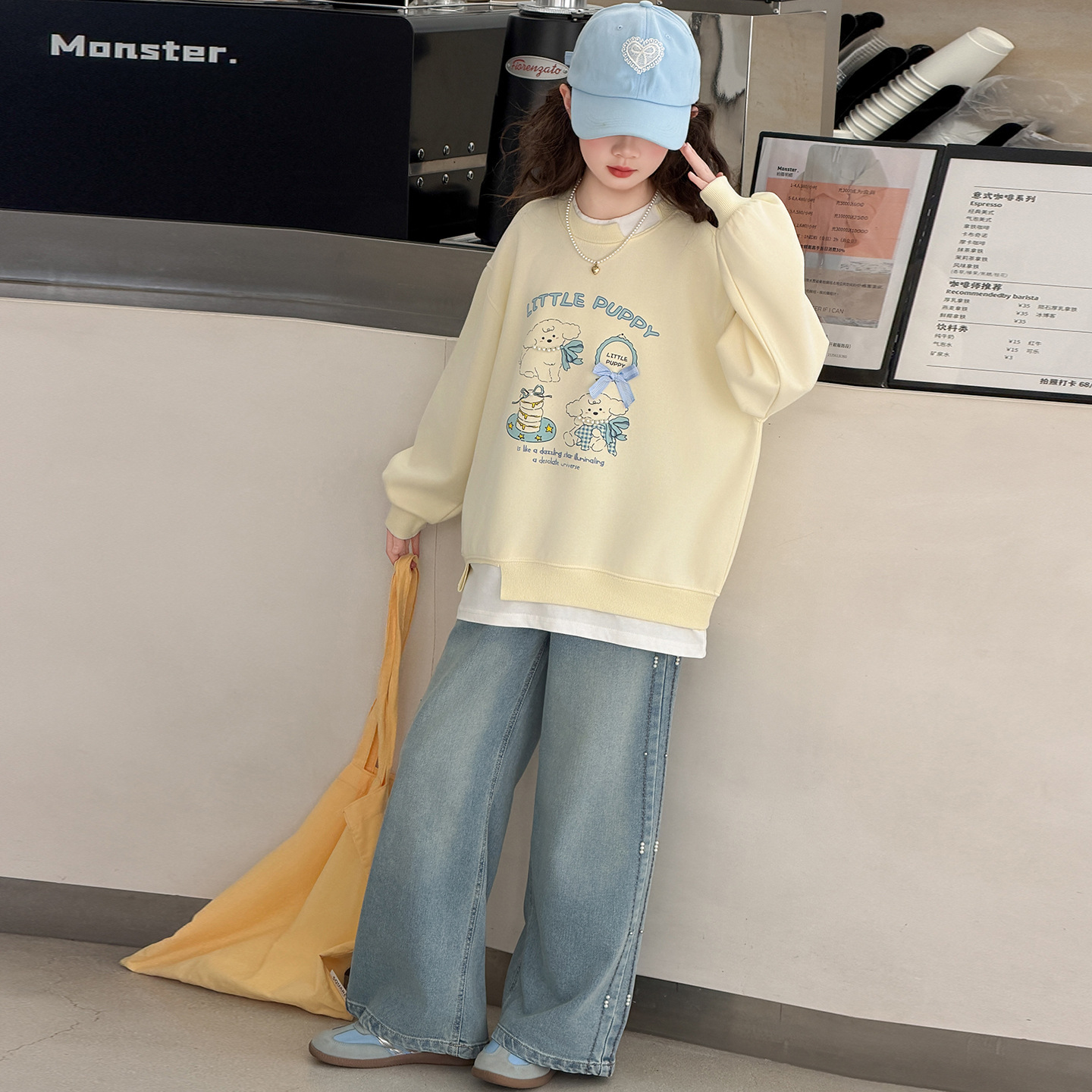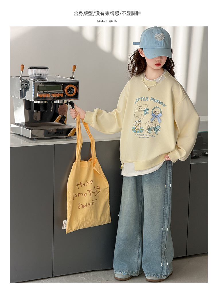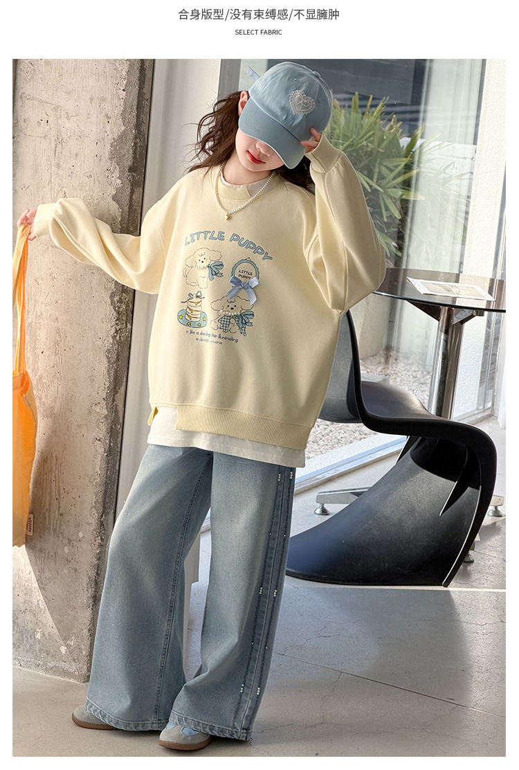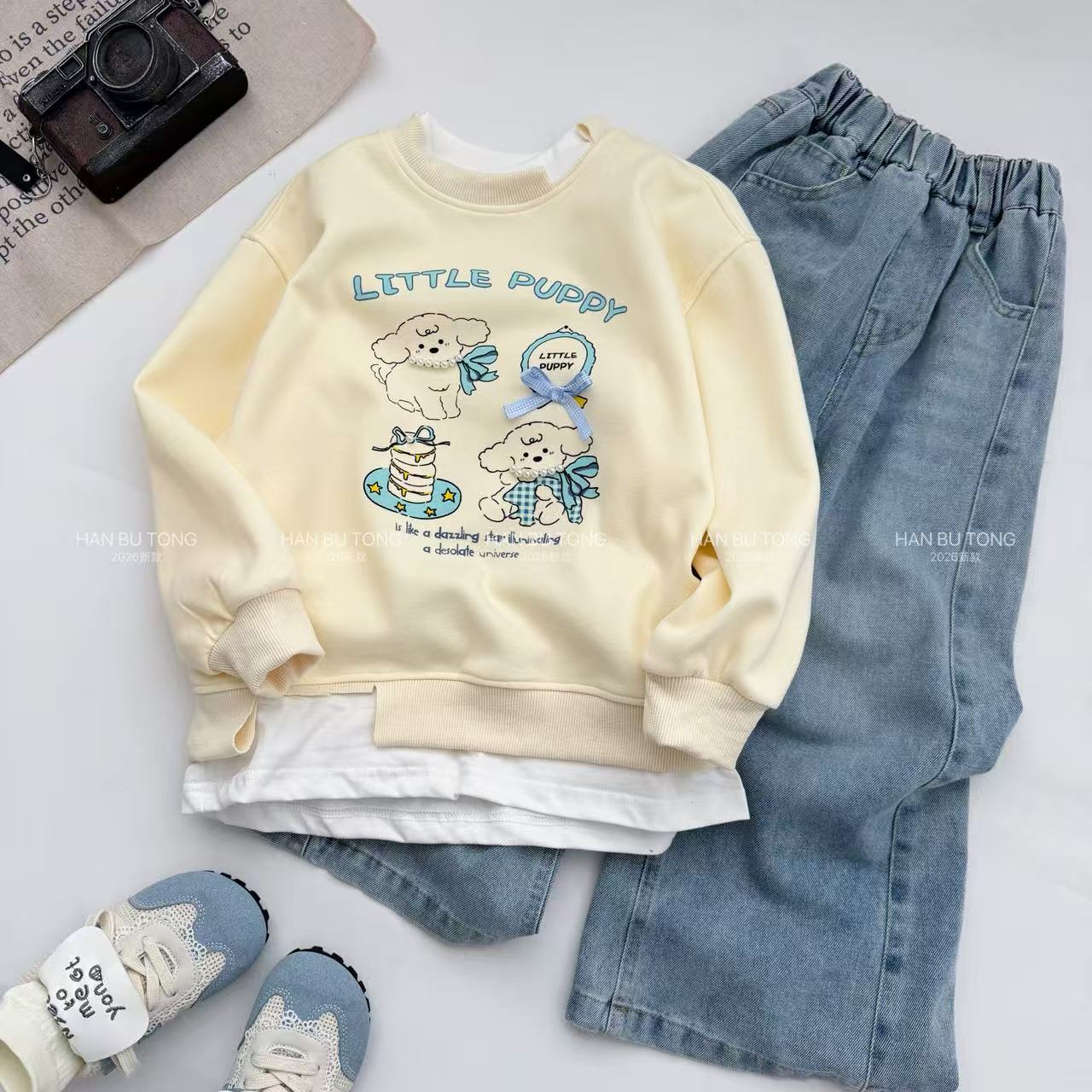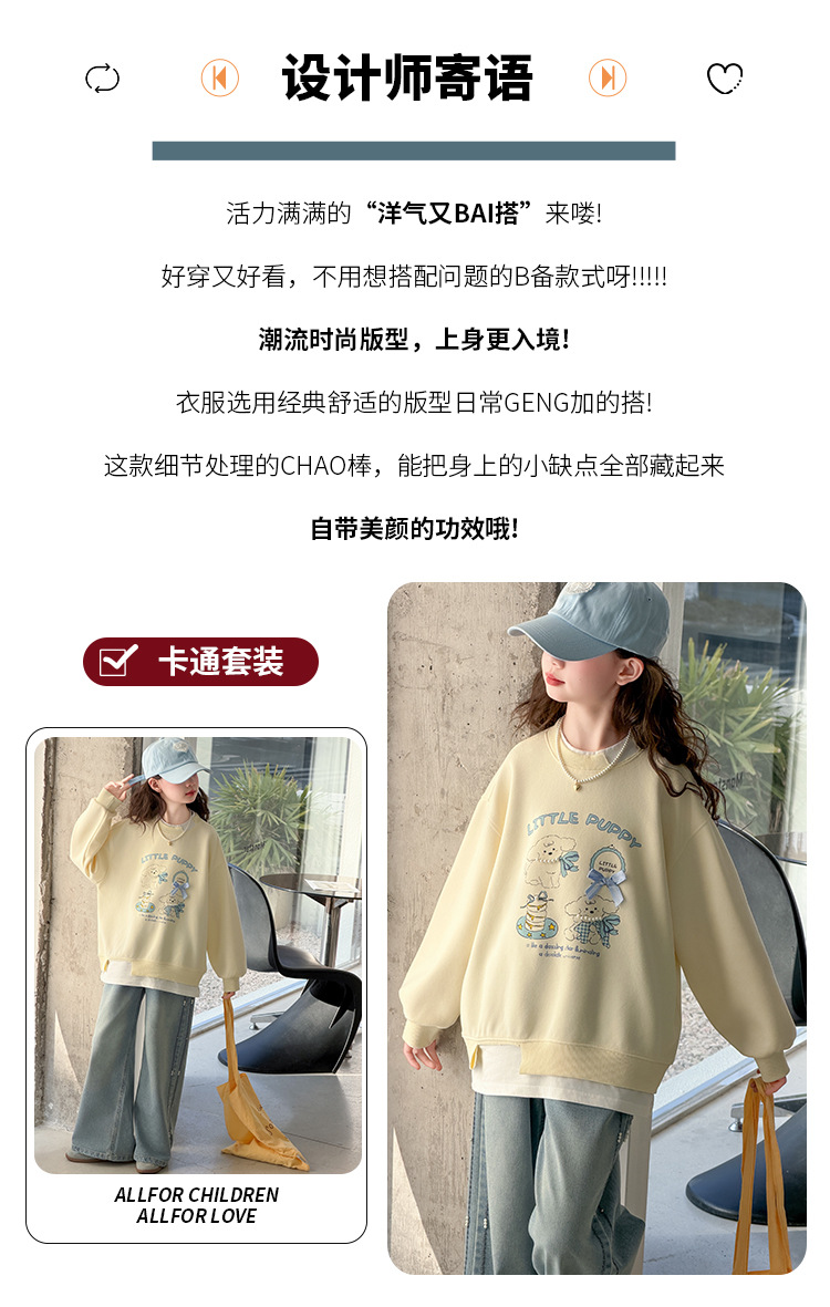 货号 F006款小狗假两件卫衣珍珠牛仔裤套装