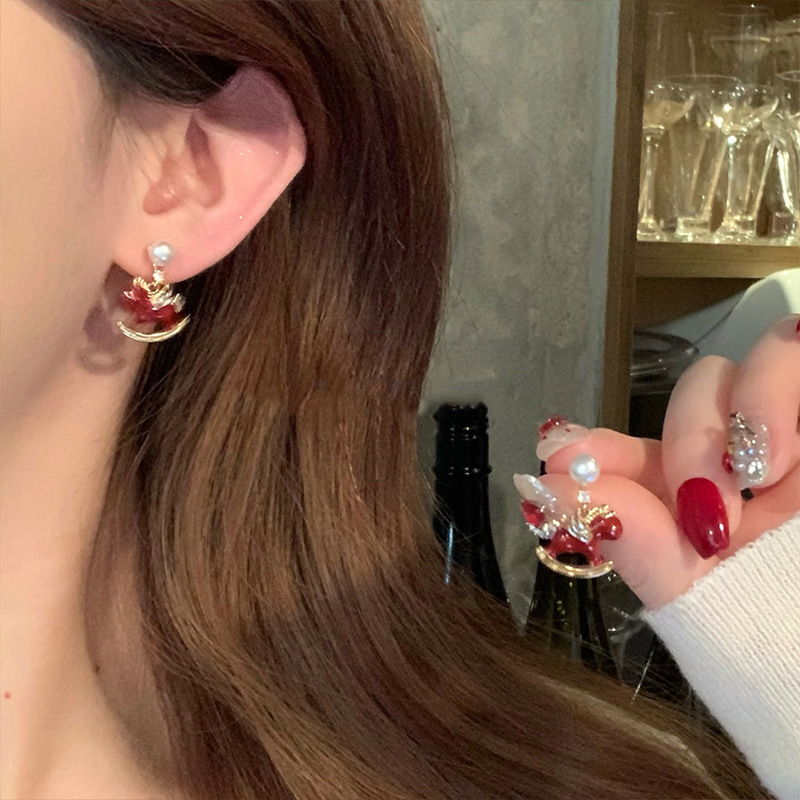 精致闪锆珍珠红色小马耳钉女新年氛围感耳饰轻奢高级感巨好看耳环