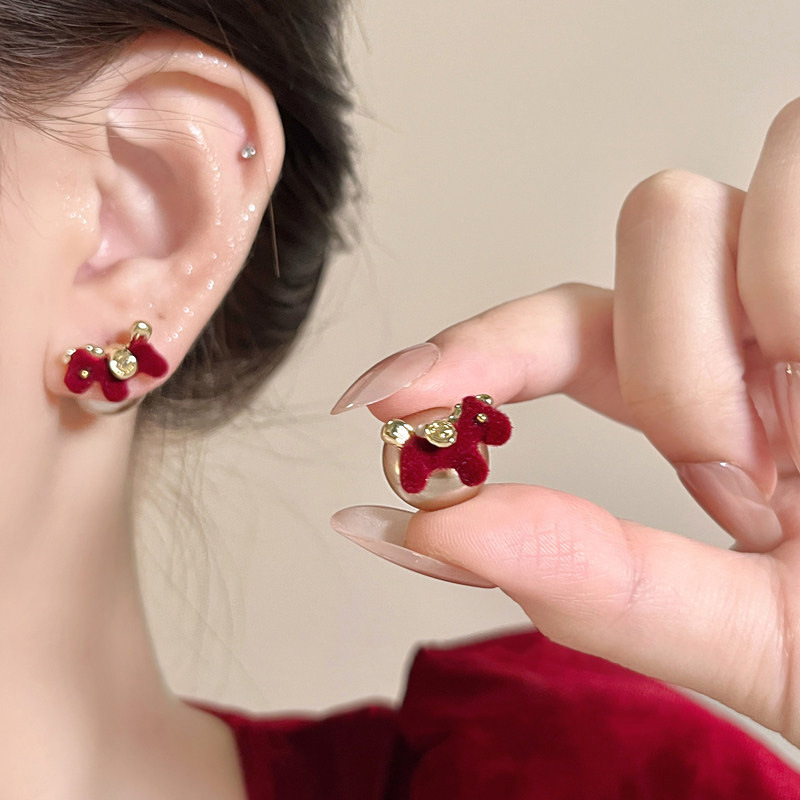 新年红色耳饰金色小马珍珠后挂式耳钉女轻奢高级感独特漂亮耳饰