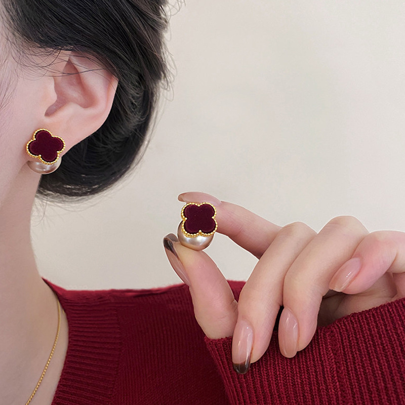 复古酒红色植绒小马珍珠耳环女轻奢高级感气质耳钉甜美蝴蝶结耳饰