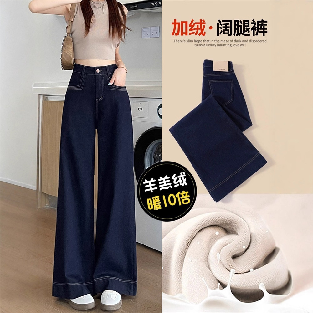 丹宁色加绒阔腿牛仔裤女秋冬宽松遮胯加厚保暖不臃肿羊羔绒直筒裤