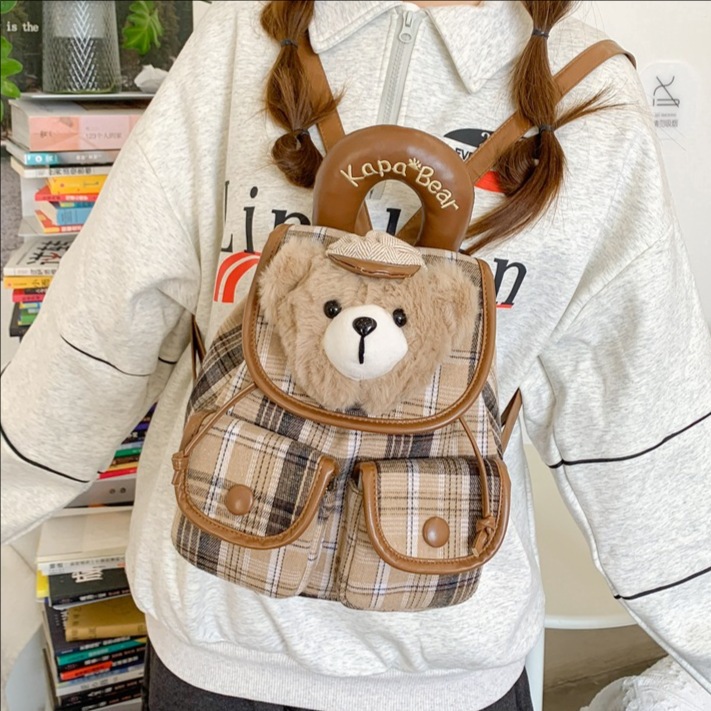 超火洋气卡通格纹迷你小背包时尚简约包包女可爱小熊头毛绒双肩包