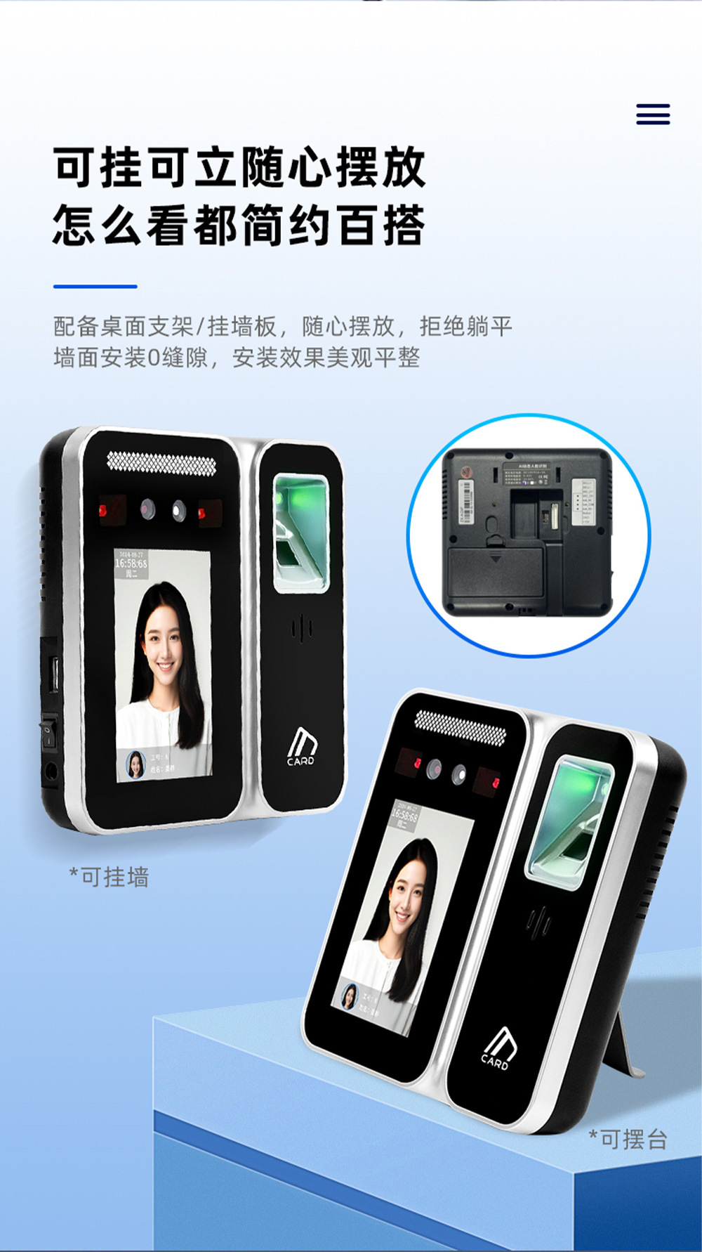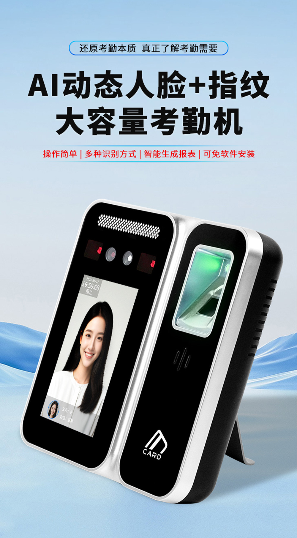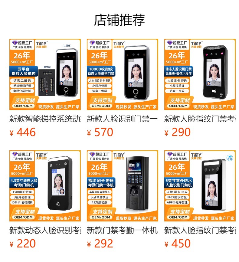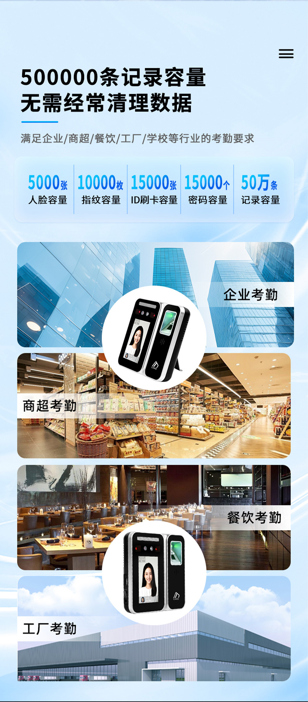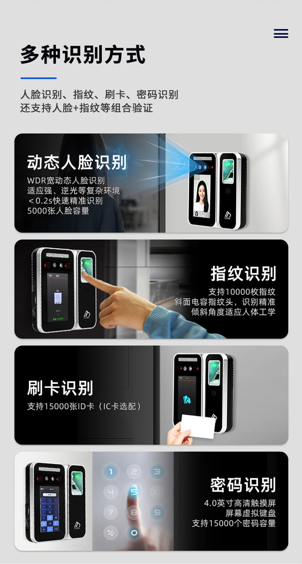 存储量 人脸容量:5000张标配、指纹容量:10000枚标配、密码容量:15000标配、刷卡容量:15000