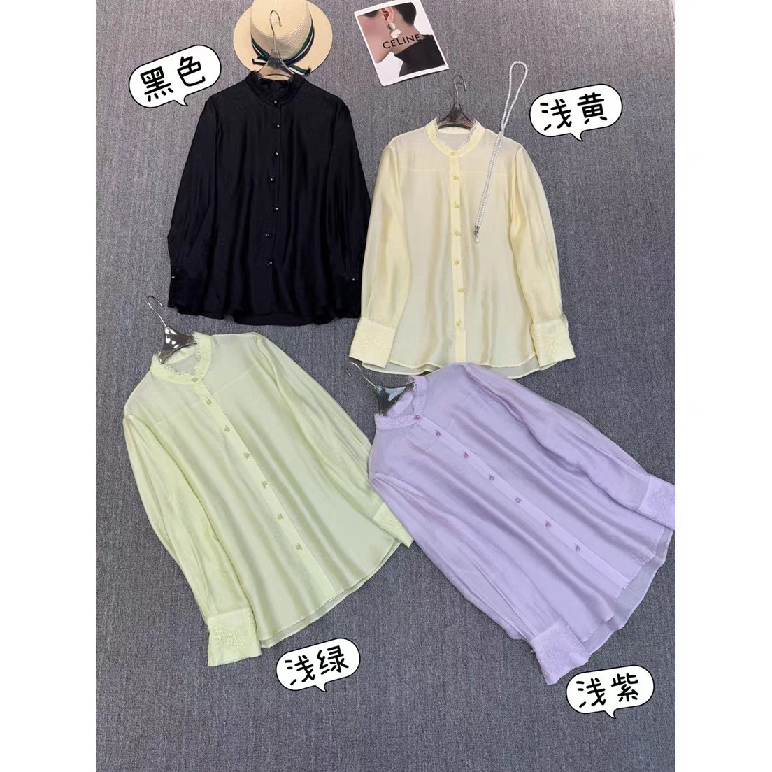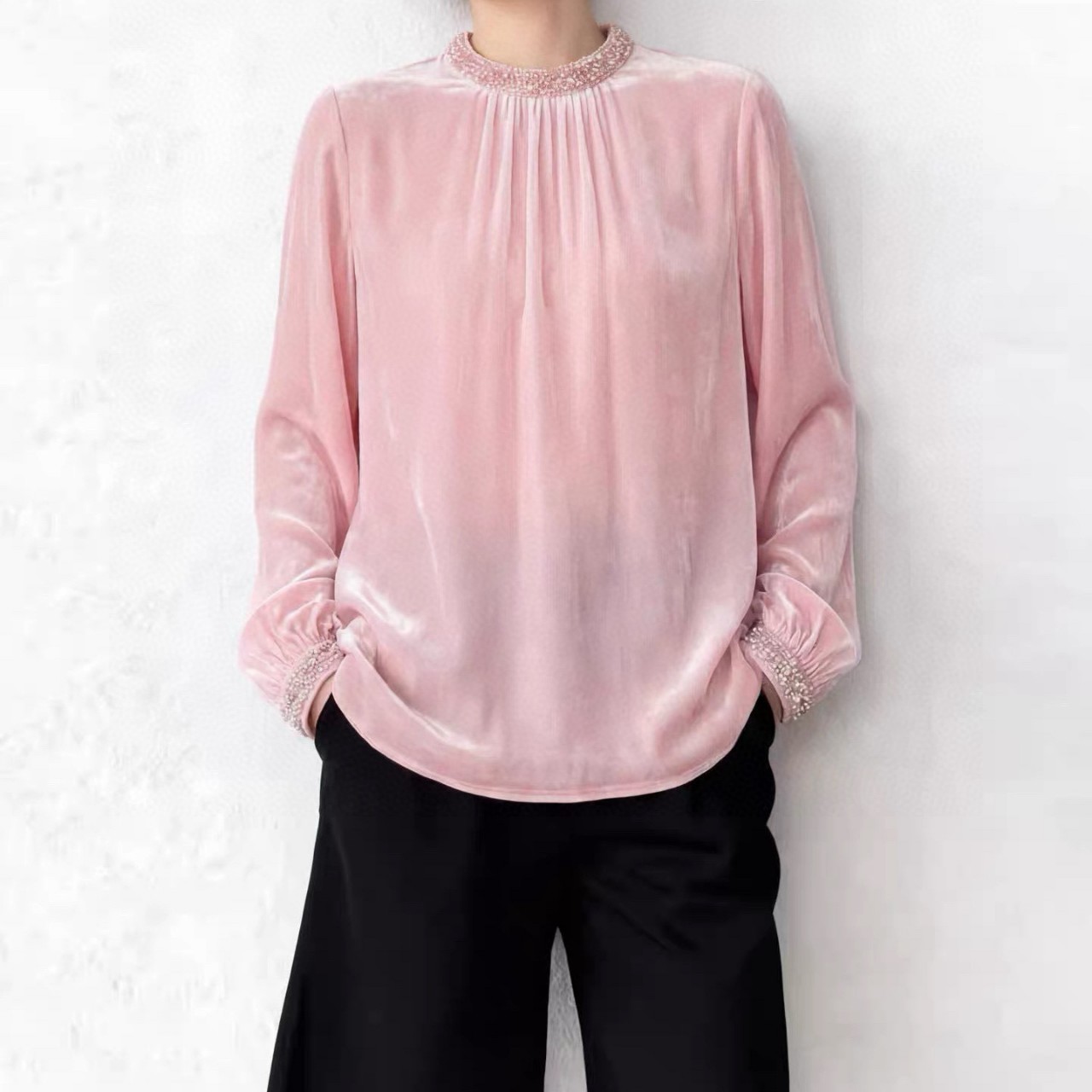 26早春真丝丝绒衬衫半高领袖口领口钉珠收褶法式优雅宽松上衣129