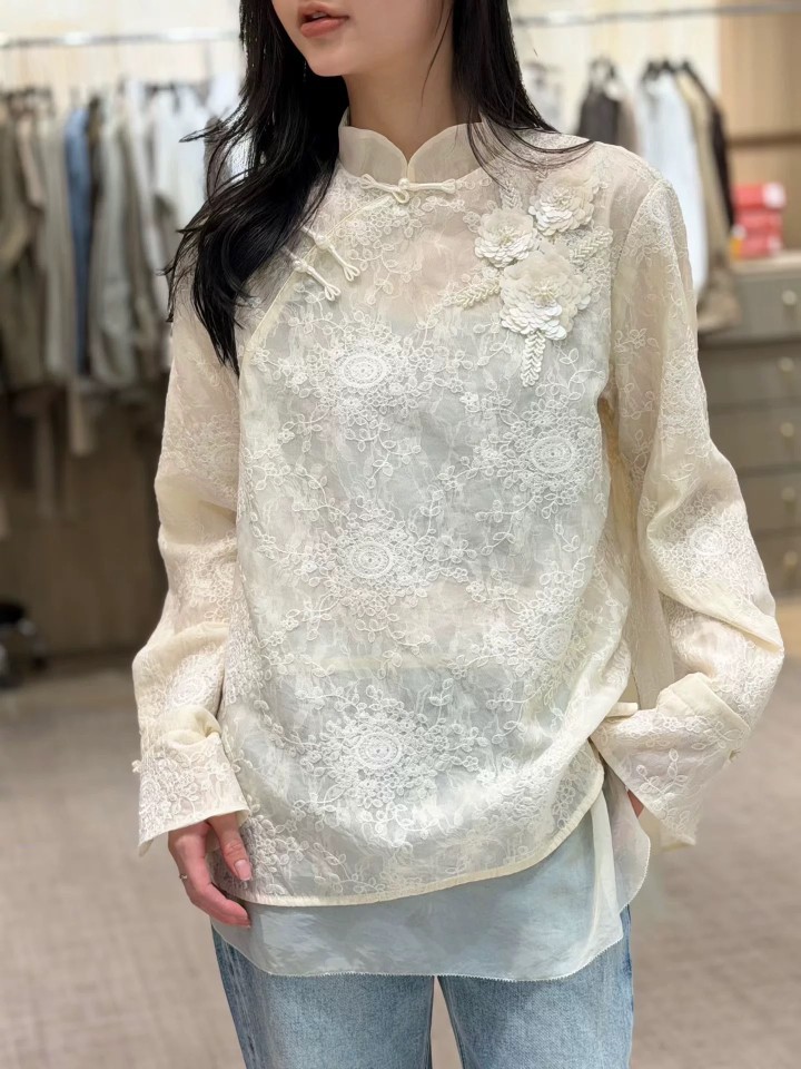 2026早春新款重工手工钉珠刺绣双层蕾丝衬衫54