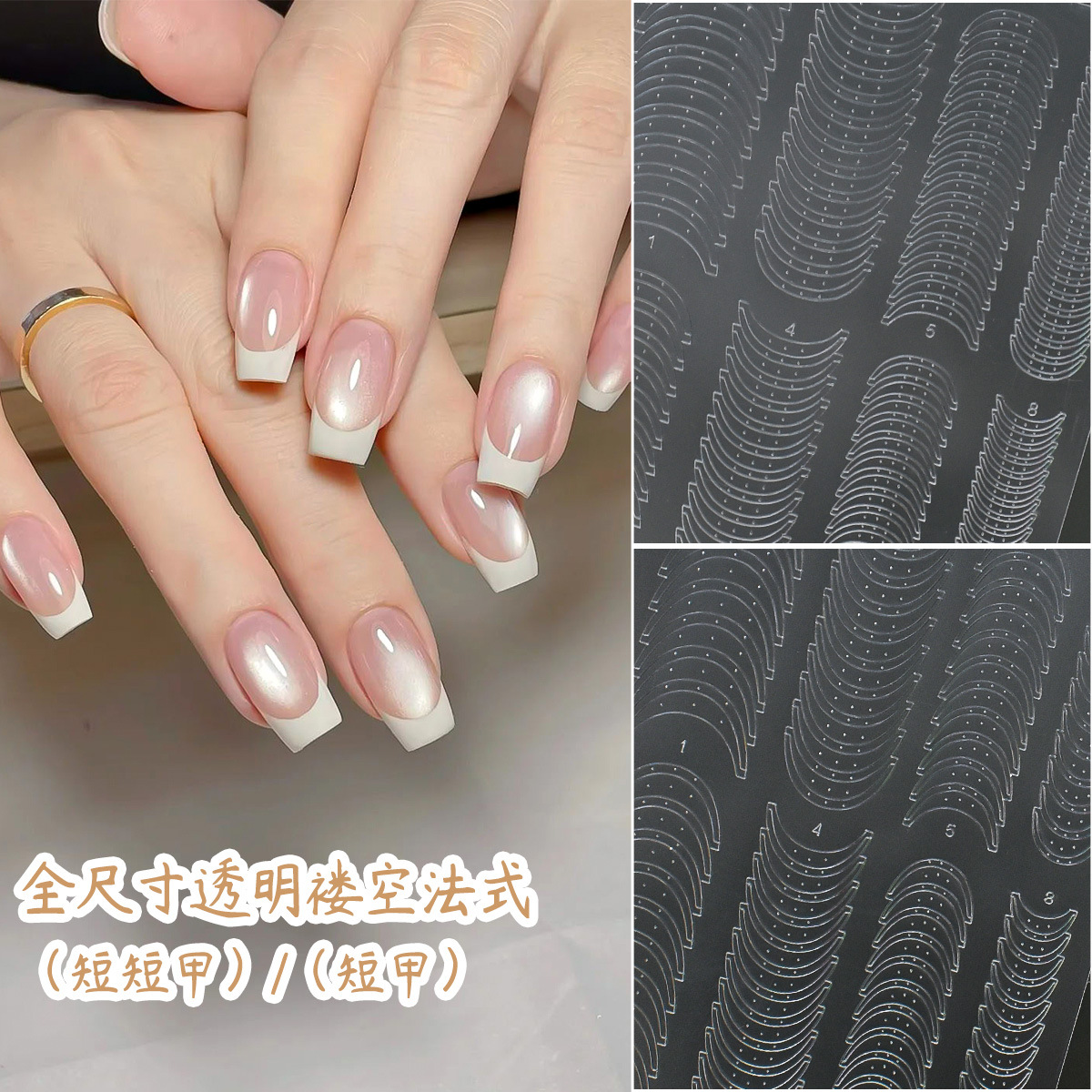 新款全尺寸透明褛空法式喷绘贴纸短短甲椭圆系列拍拍胶辅助指甲贴