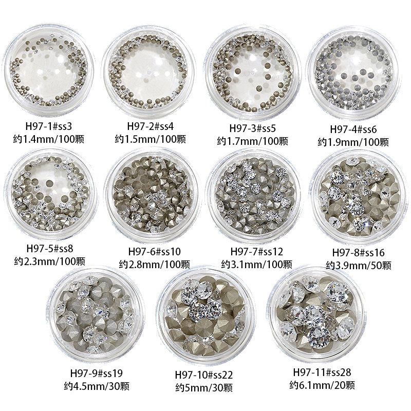 规格 H97-1#SS3 100颗 【约1.4mm】,H97-2#SS4 100颗 【约1.5mm】,H97-3#SS5 100颗 【约1.7mm】,H97-4#SS6 100颗 【约1.9mm】,H97-5#SS8 100颗 【约2.3mm】,H97-6#SS10 100颗 【约2.8mm】,H97-7#SS12 100颗 【约3.1mm】,H97-8#SS16 50颗 【约 3.9mm】,H97-9#SS19 30颗 【约4.5mm】,H97-10#SS22 30颗 【约5mm】,H97-11#SS28 20颗 【约6.1mm】