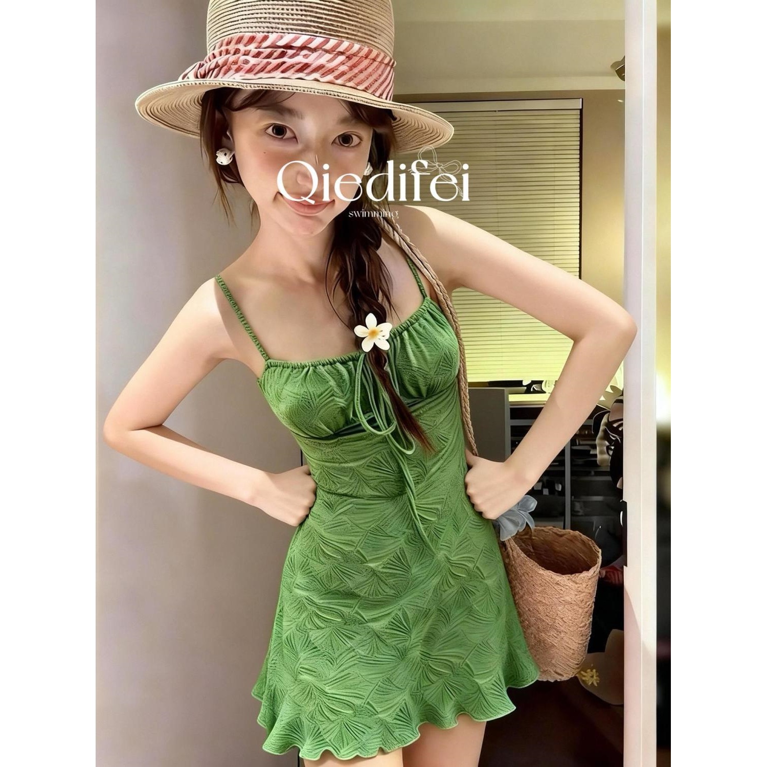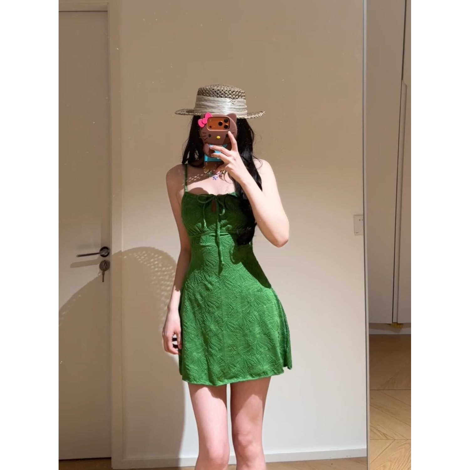 复古度假肌理感绿色吊带抹胸游泳衣小个子短裙温泉度假拍照穿搭