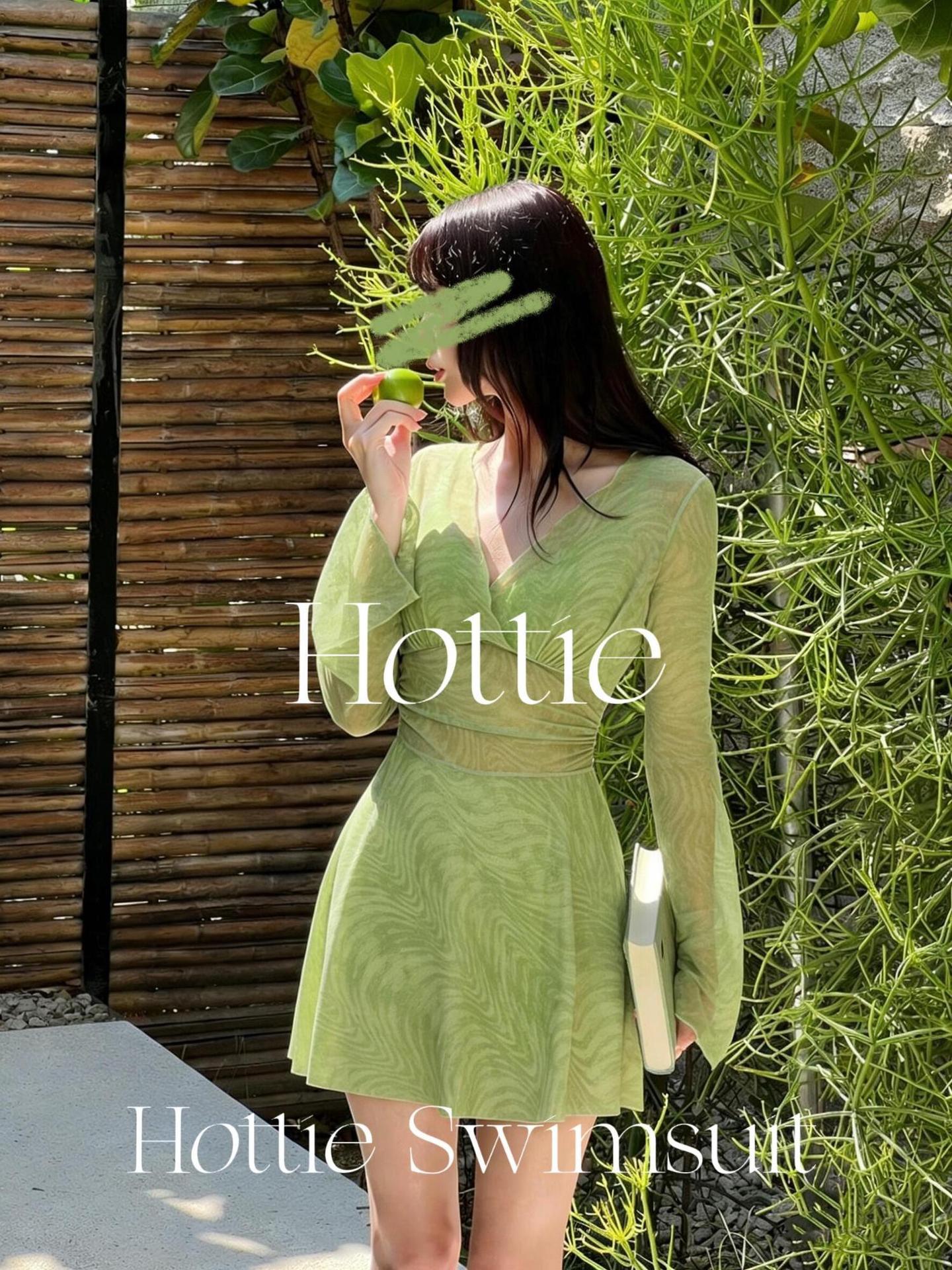 显白绿色显瘦遮肉收腰连衣裙分体泳衣两件套温泉海边度假泳衣保守