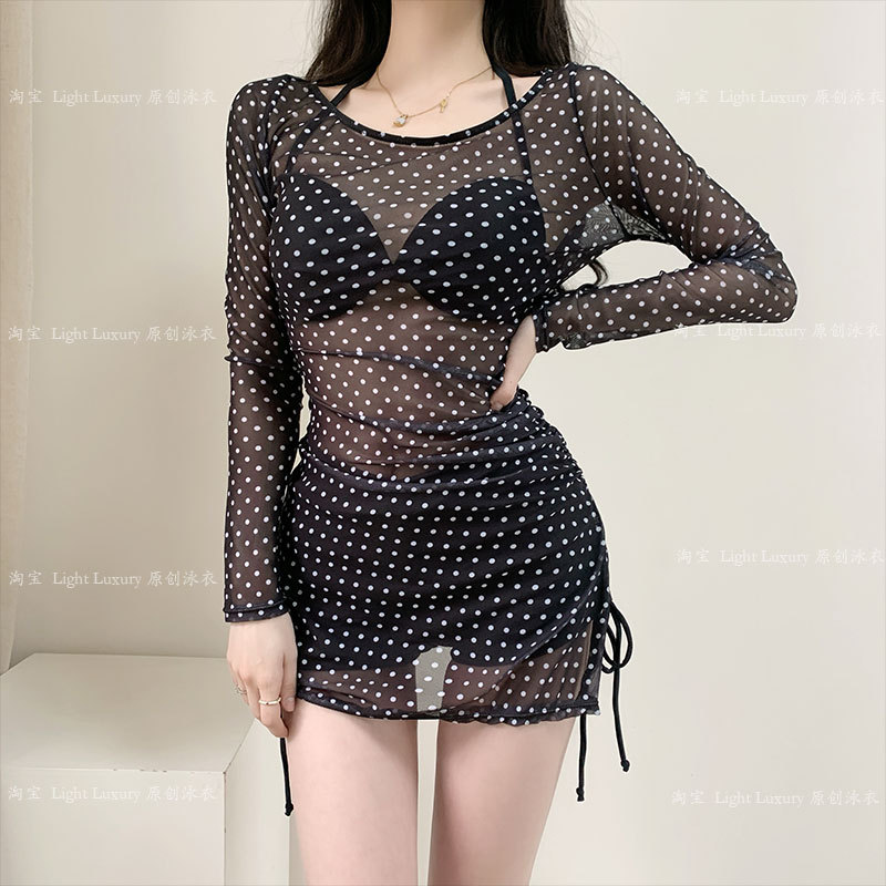 ビキニ水着女性黒波点長袖ブラウス三点セット分体小胸隠し腹痩せビーチ温泉
