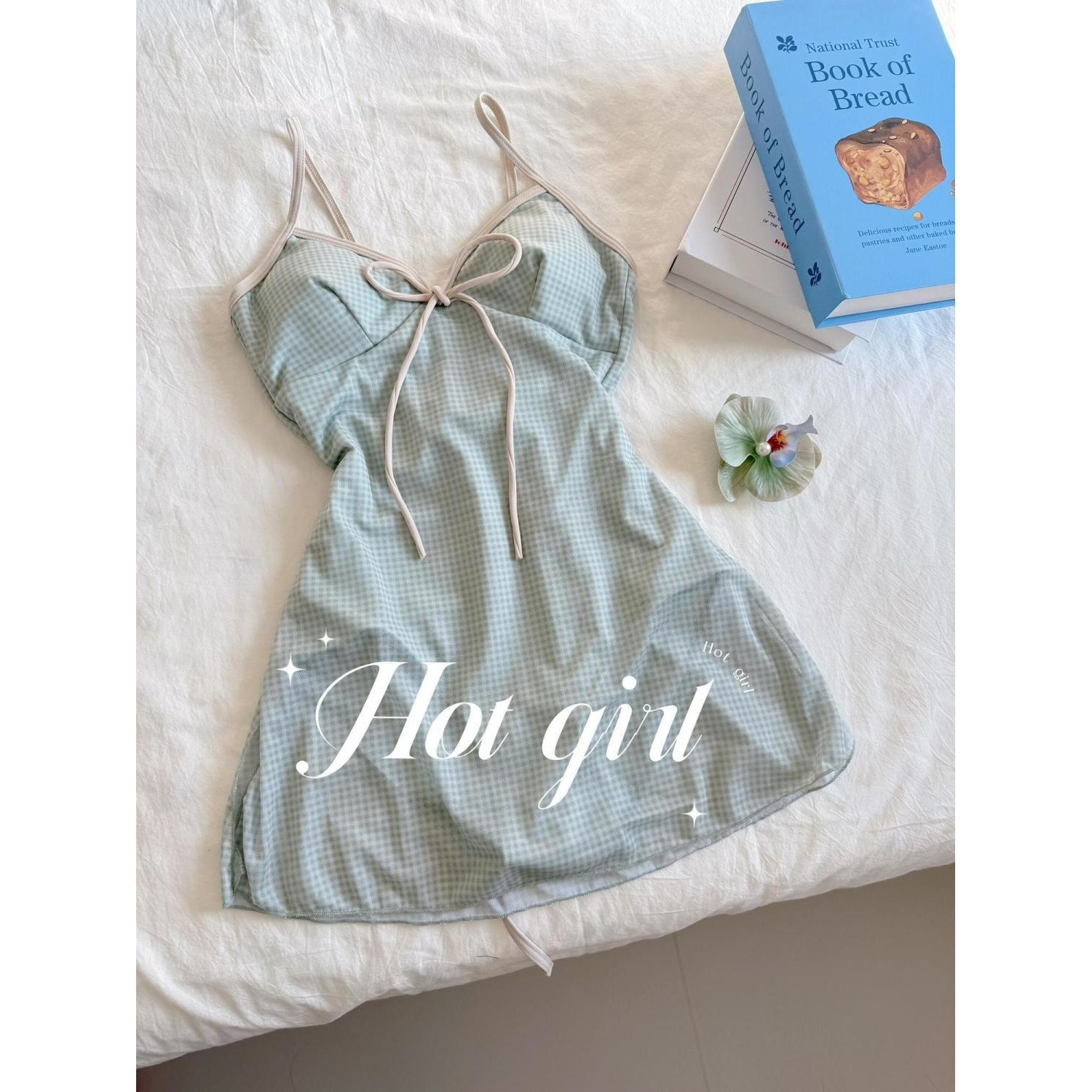【栀子与清茶】韩系格子小清新连体裙式泳衣女显瘦度假风温泉泳装