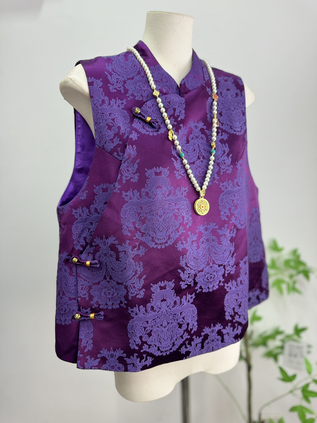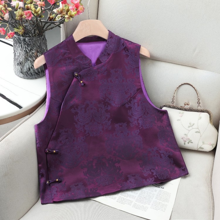 新中式紫色民族风提花马甲女2025秋季复古国风叠穿立领轻奢马夹