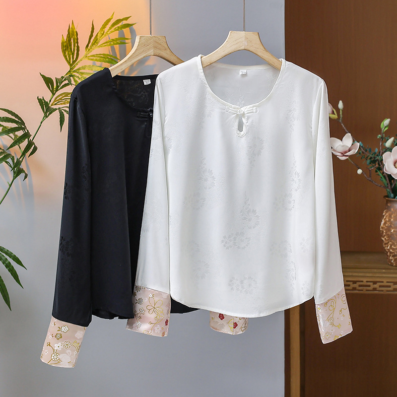 新中国式国風春装新長袖百合底上着ファッションジャカード丸襟盤ボタンゆったりtシャツ