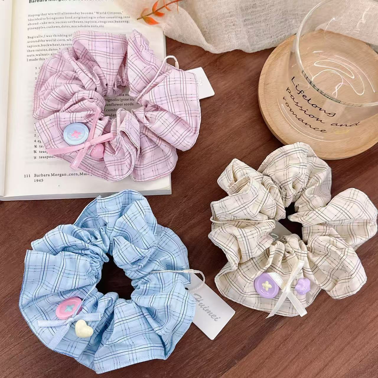 新款发饰批发小清新学生格纹大肠圈缀圆盘扣子蝴蝶结发圈马尾圈女
