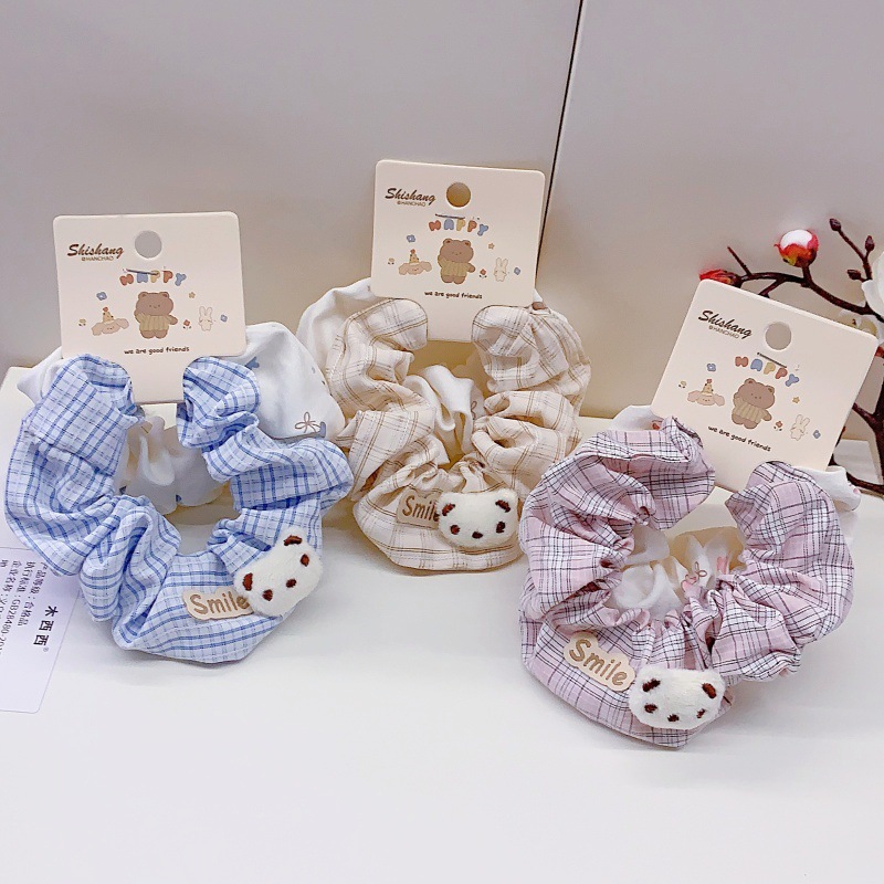 新款发饰批发时尚小女孩儿童学生格纹缀小熊头发圈组合大肠圈头扎