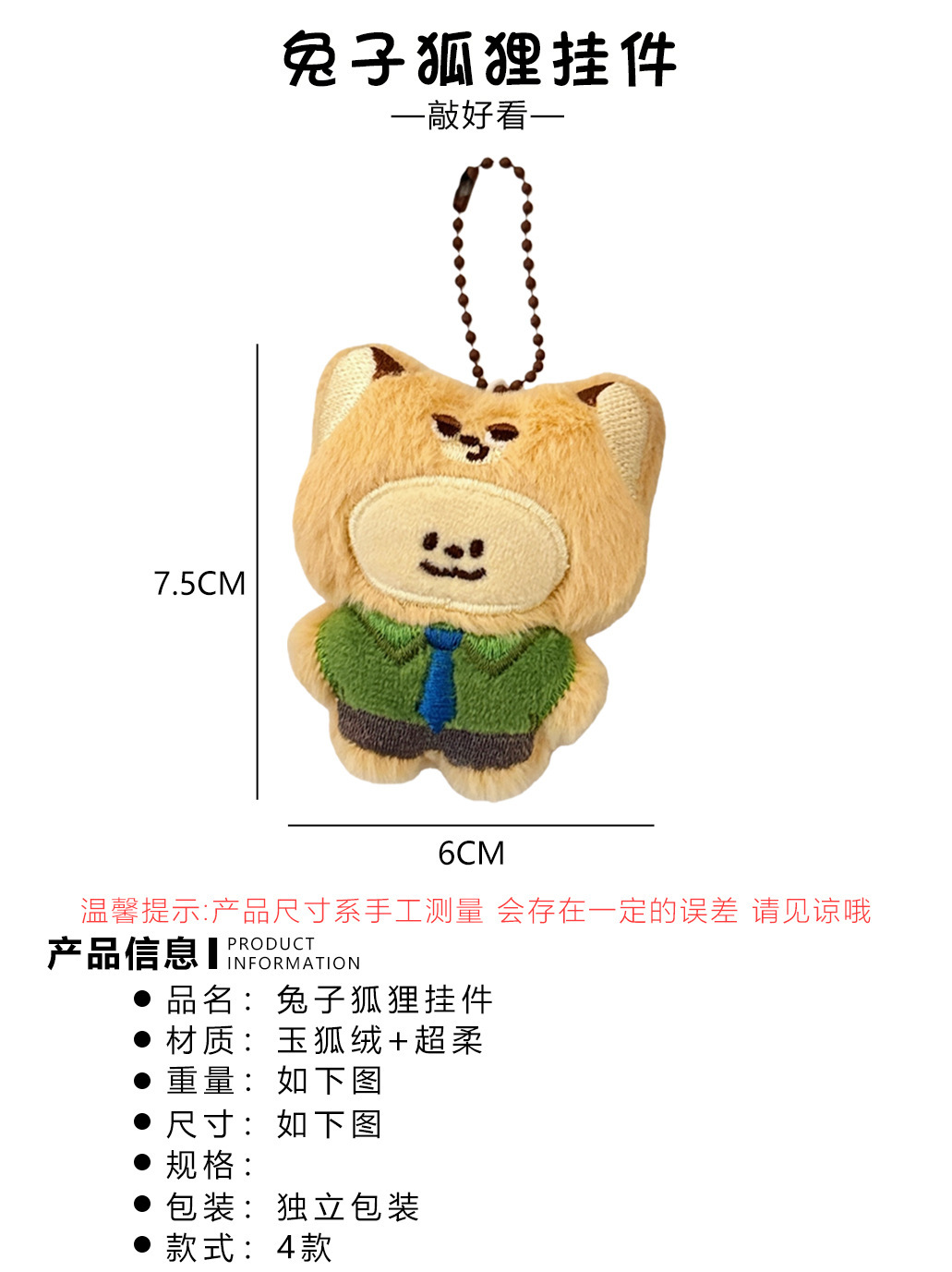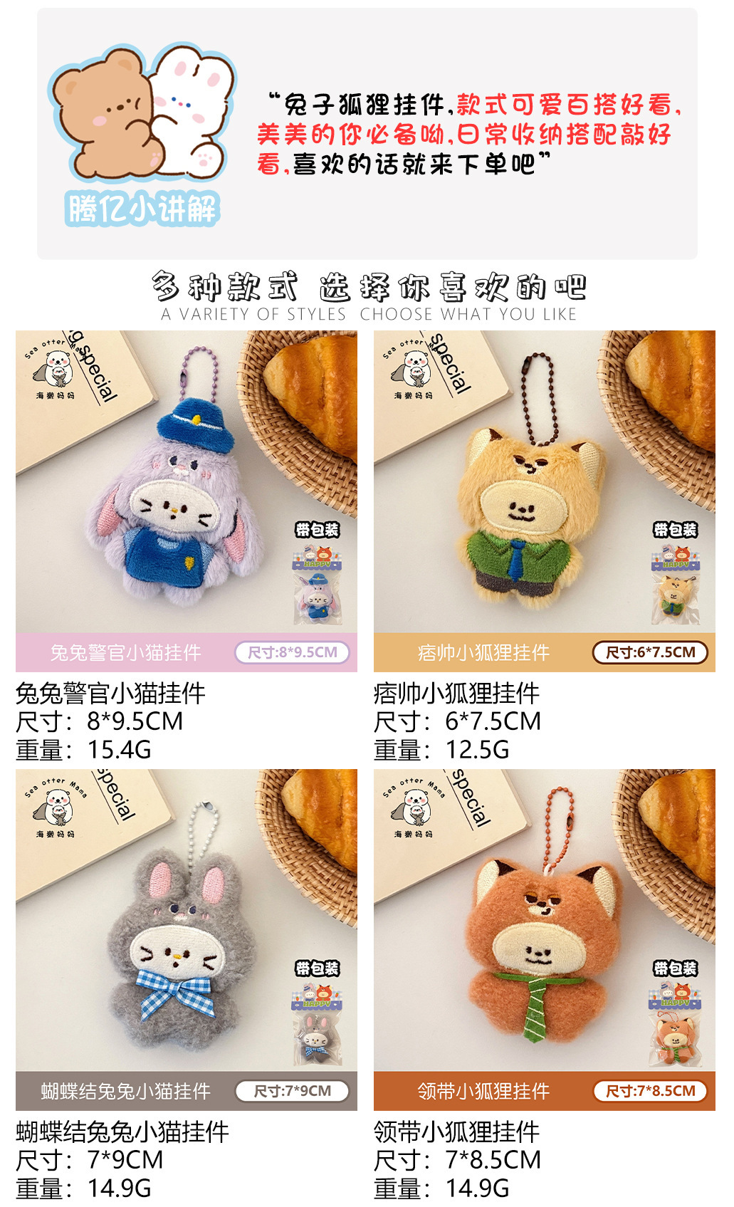 颜色 1#兔兔警官小猫挂件,2#痞帅小狐狸挂件,3#蝴蝶结兔兔小猫挂件,4#领带小狐狸挂件,1#鼠鼠头套小猫公仔挂件,2#橘子头套小猫公仔挂件,3#番茄头套小猫公仔挂件,4#大葱头套小猫公仔挂件,5#布丁头套小猫公仔挂件,6#熊熊头套小猫公仔挂件,1#炸虾头套小猫挂件,2#咪咪头套小猫挂件,3#草莓头套小猫挂件,4#鸭梨头套小猫挂件,5#鱼鱼头套小狗挂件,6#面包头套小猫挂件