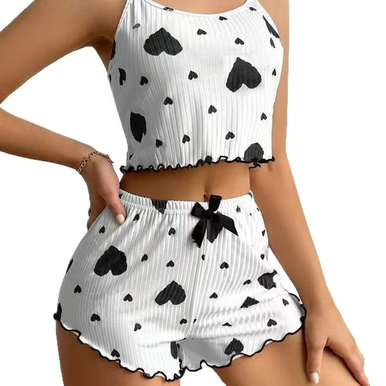 欧美女士家居服爱心印花吊带短裤套装坑条可外穿女士睡衣休闲套装