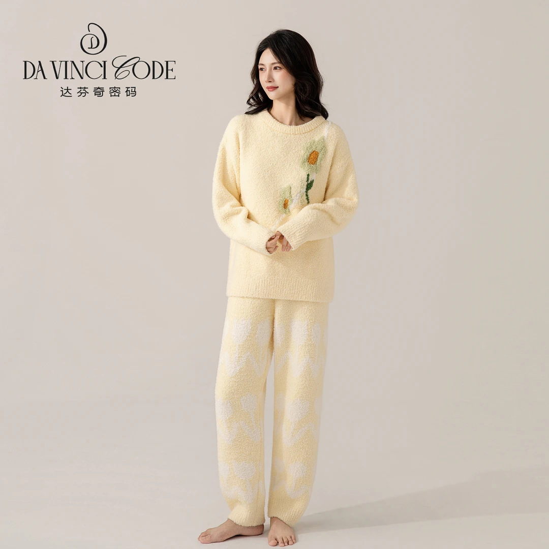 达芬奇密码秋冬新款半边绒睡衣圆领太阳花秋冬加厚家居服套装女